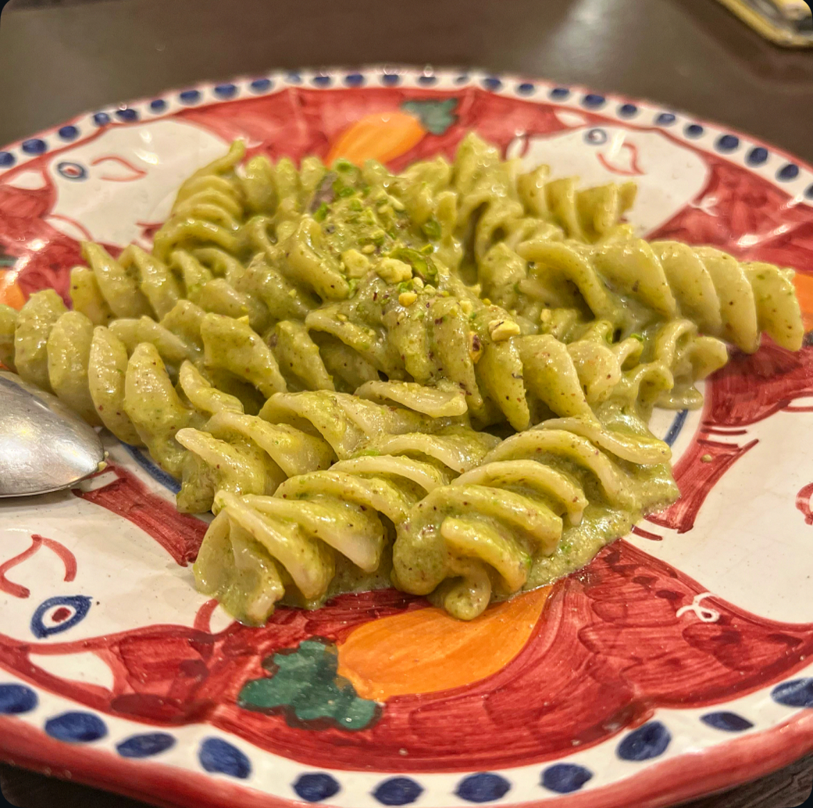 ぐるぐるショートパスタに濃厚ピスタチオのペーストソース。