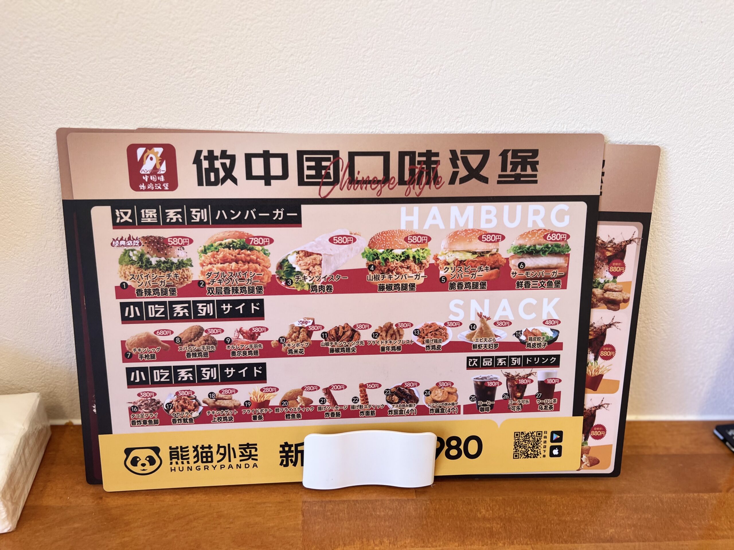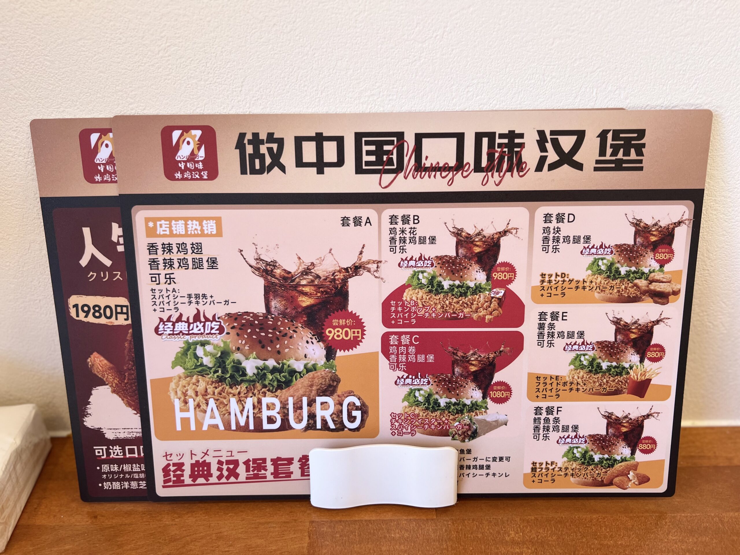赤い看板が目印、チャイニーズスパイシーチキンバーガーだ。