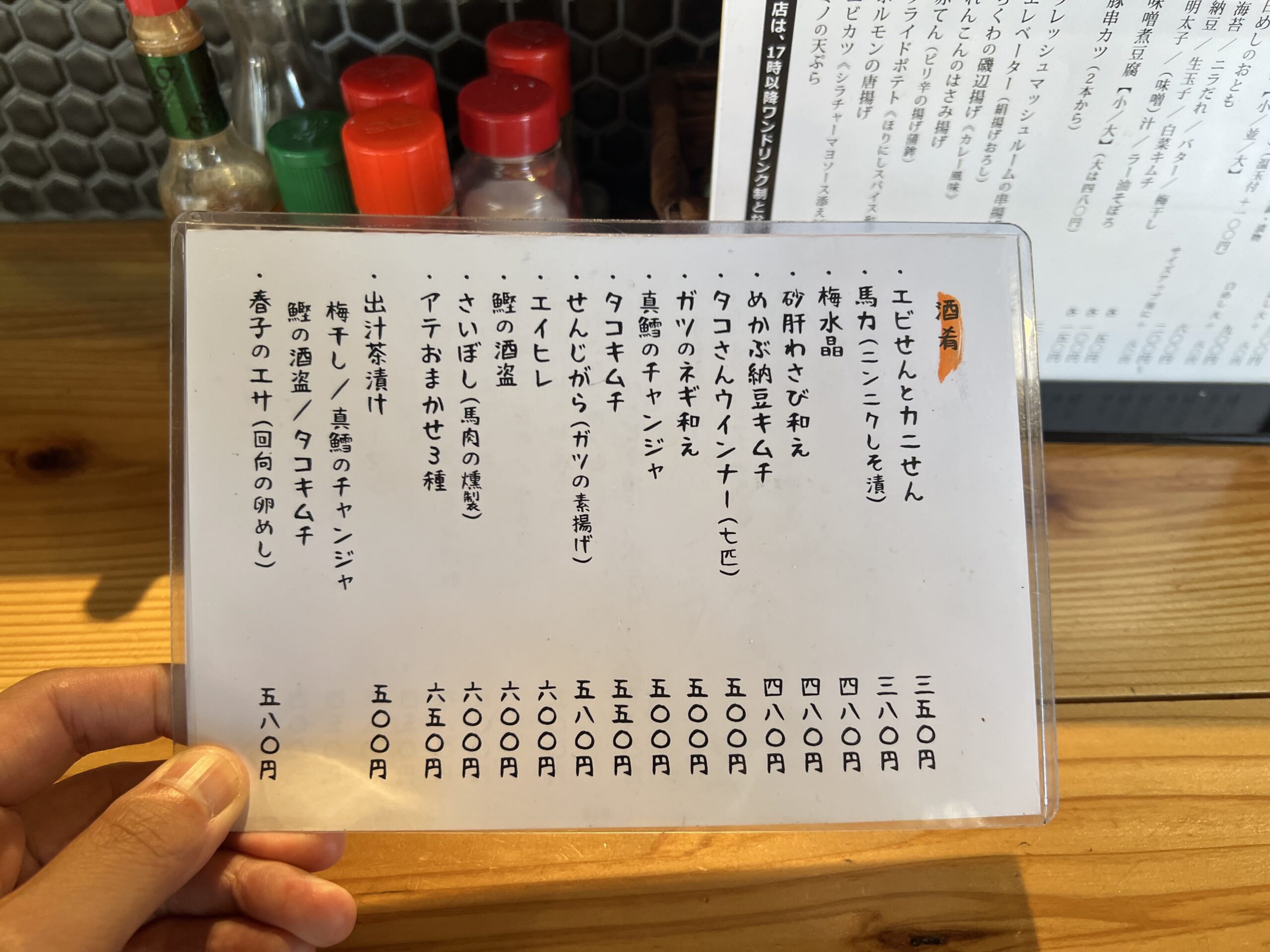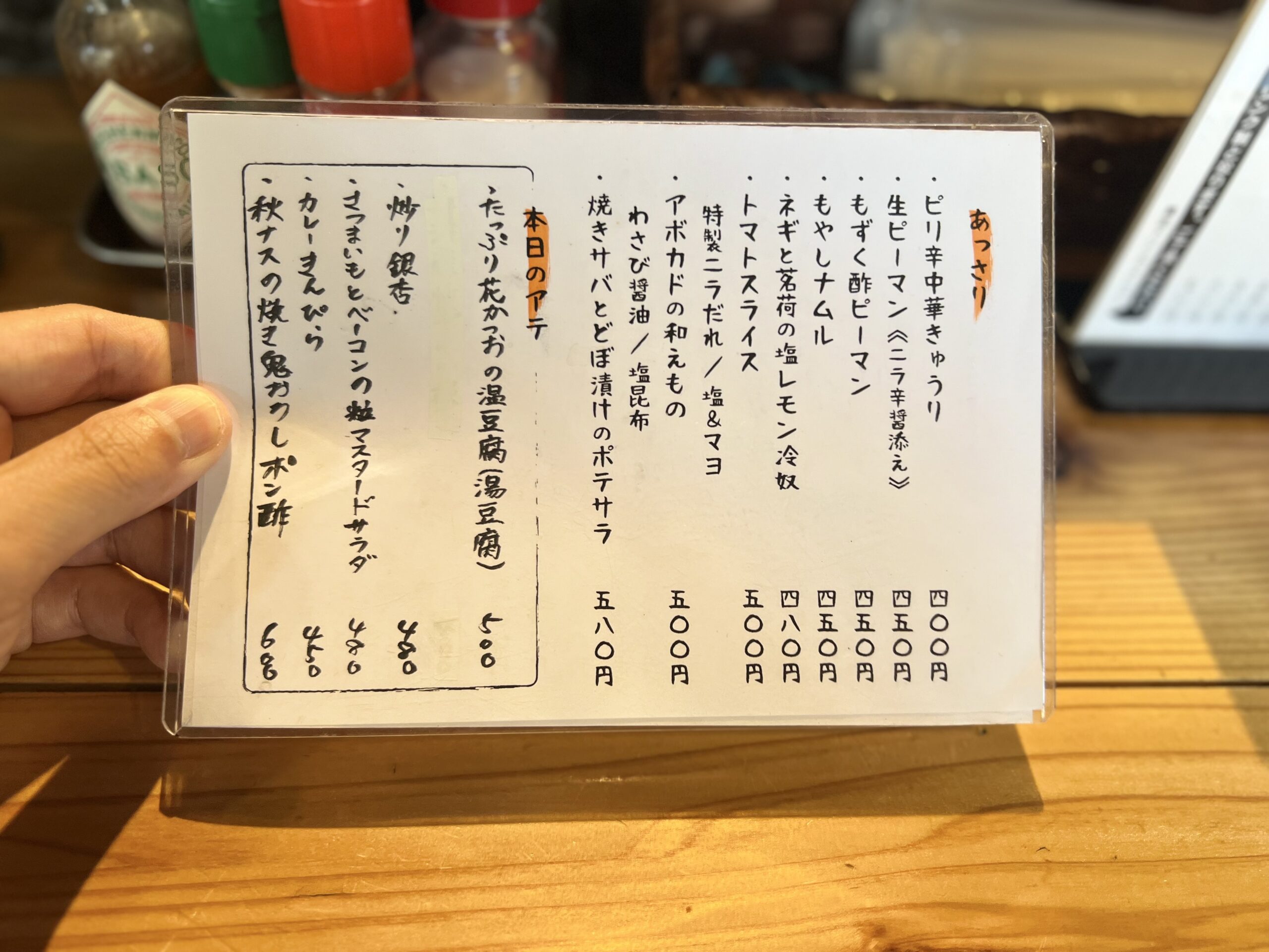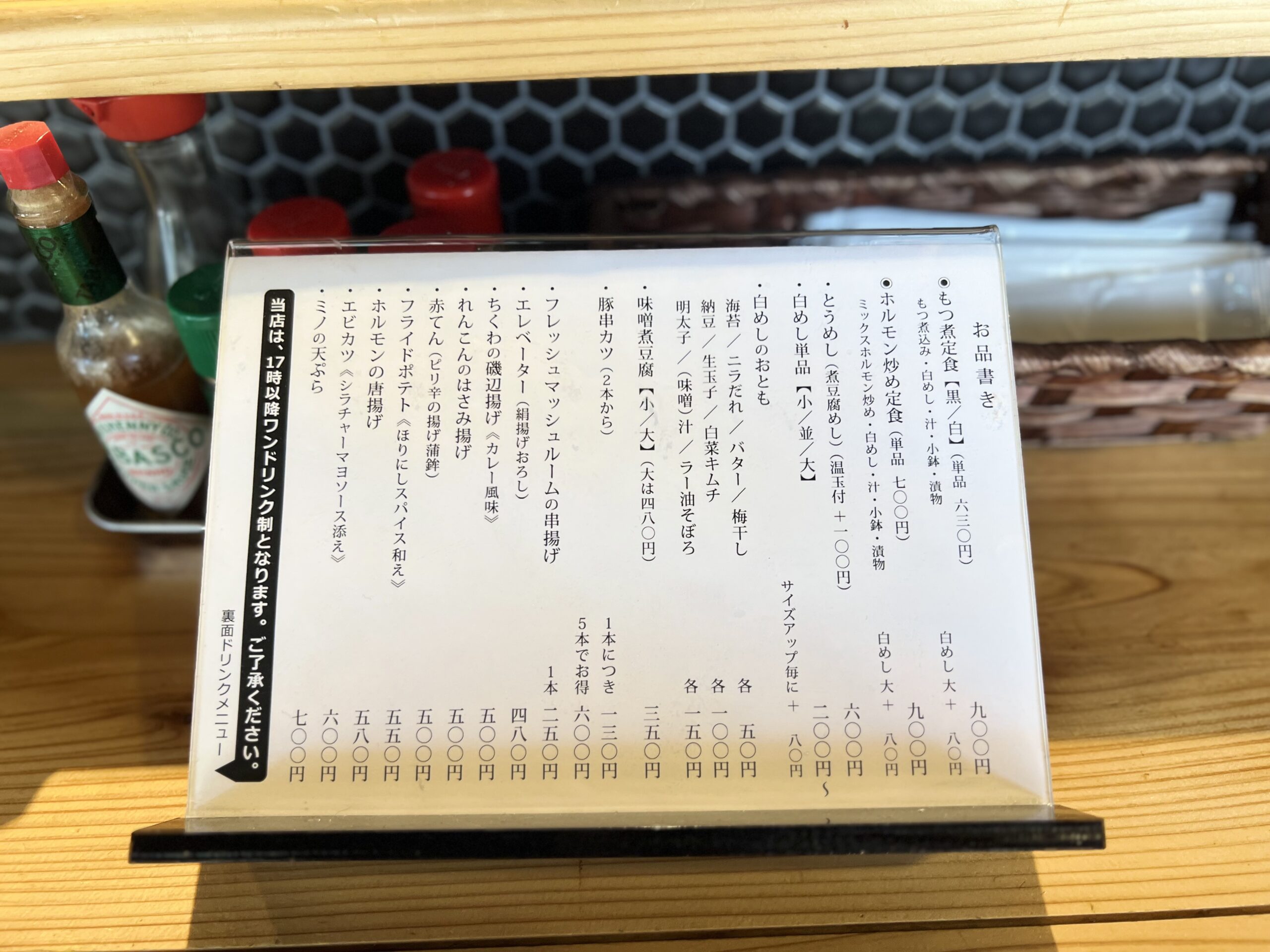 豚と牛のミックスホルモンを使用した「モツ煮こみ」や、豚のホルモンを自家製のピリ辛たれに漬け込んだ「ホルモン炒め」の定食や逸品、季節アテに定番の酒場メニューがズラリ。