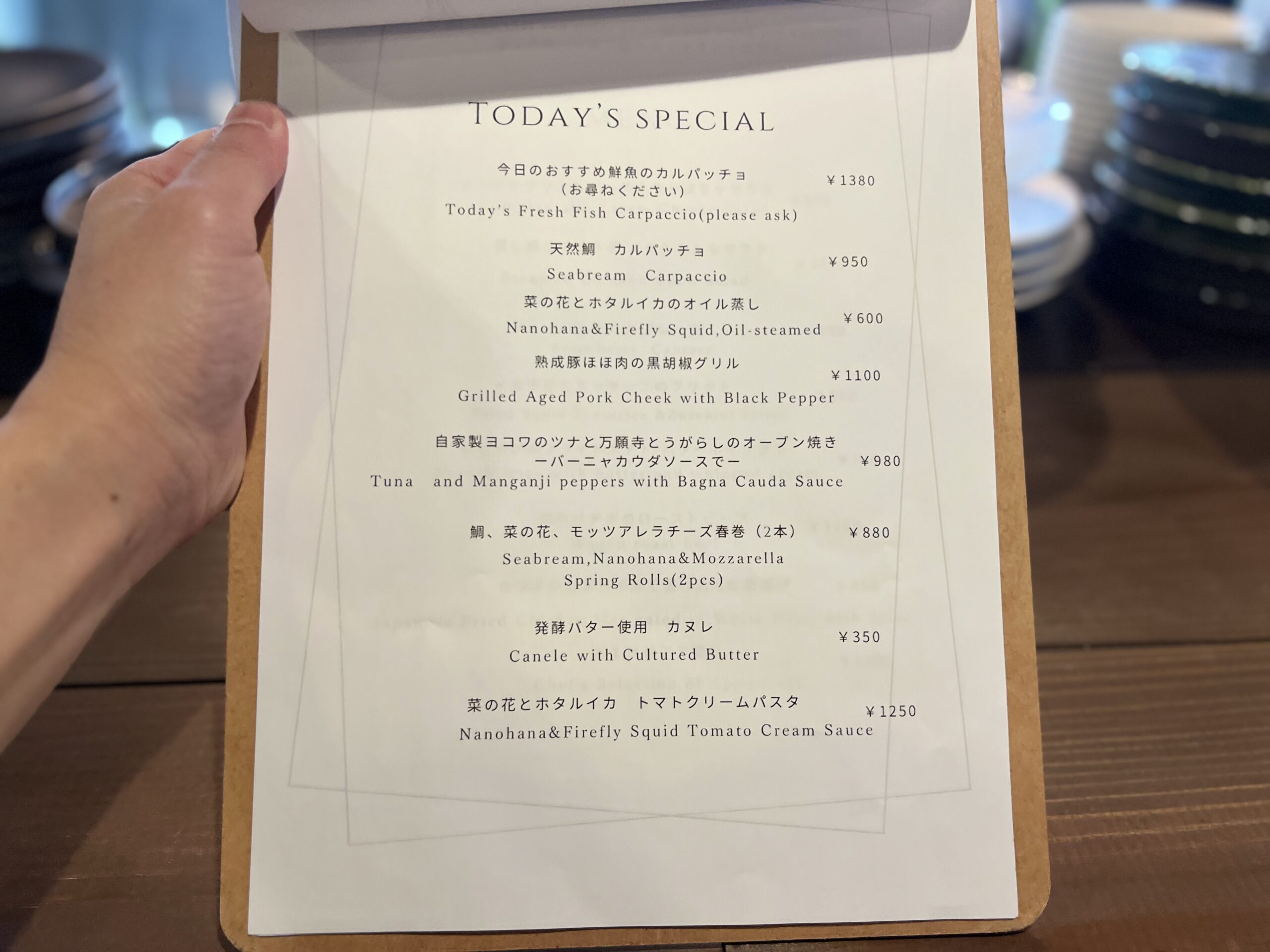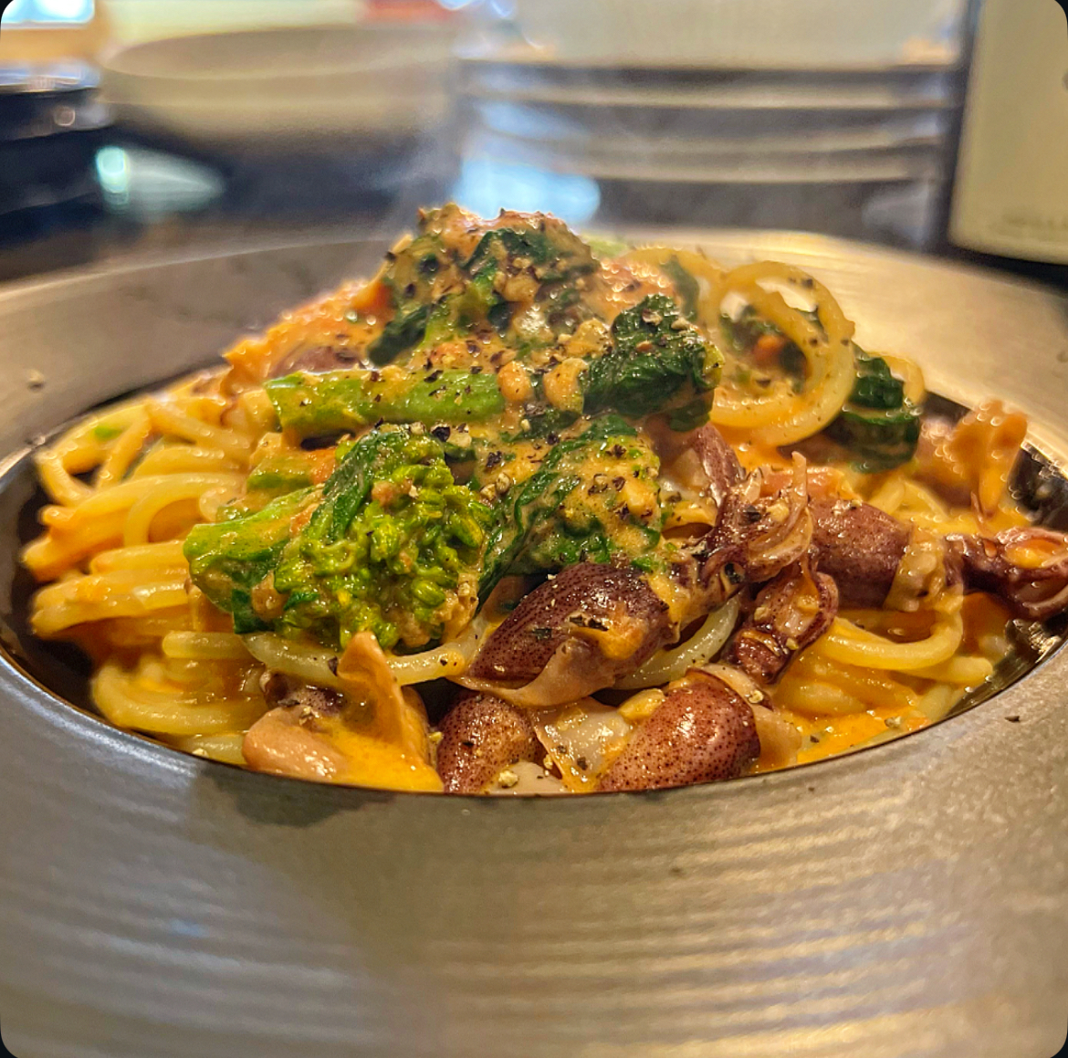この日は菜の花とホタルイカ、季節食材でつくるパスタは美味。
