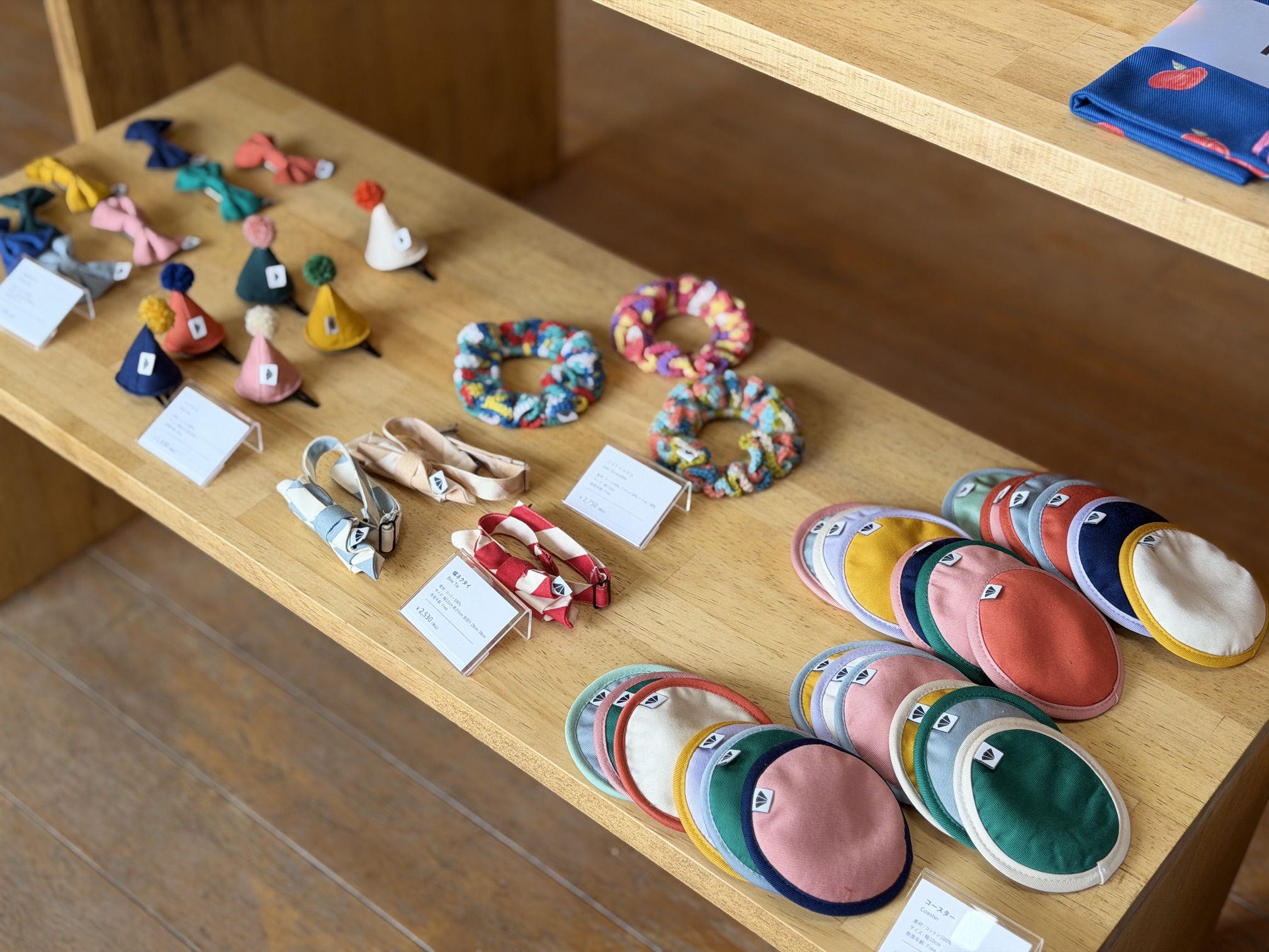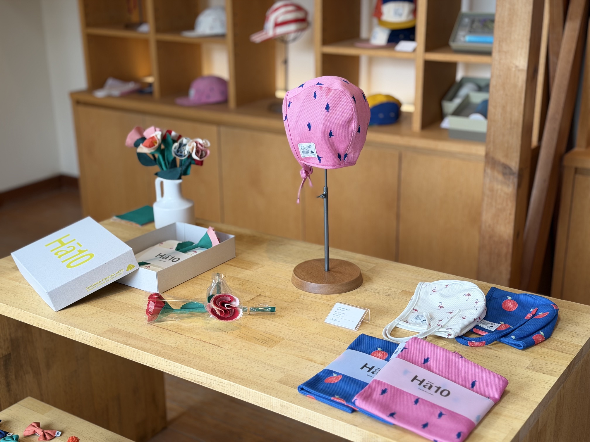 明るい光が差し込む店舗は、色鮮やかな生地で作った子ども用帽子をはじめ、雑貨、エプロン、器などがズラリ。