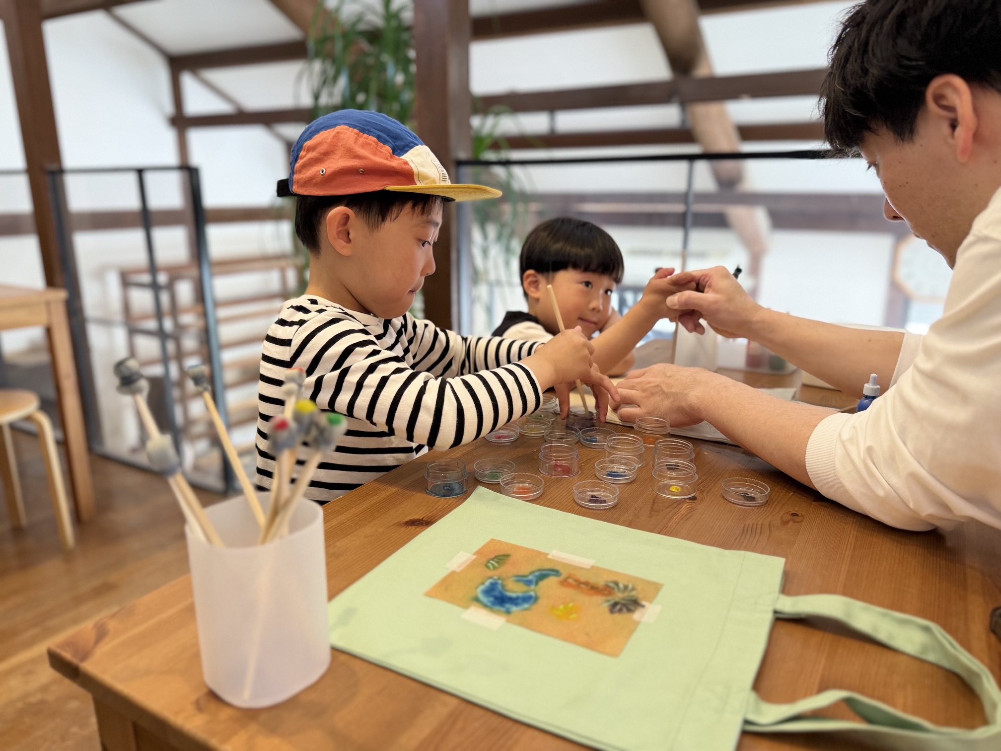 ワークシップでは、オリジナルの型紙を使ってトートバッグを染めていく体験が楽しめる。特に子どもはものづくりに触れる第一歩としておすすめだ。