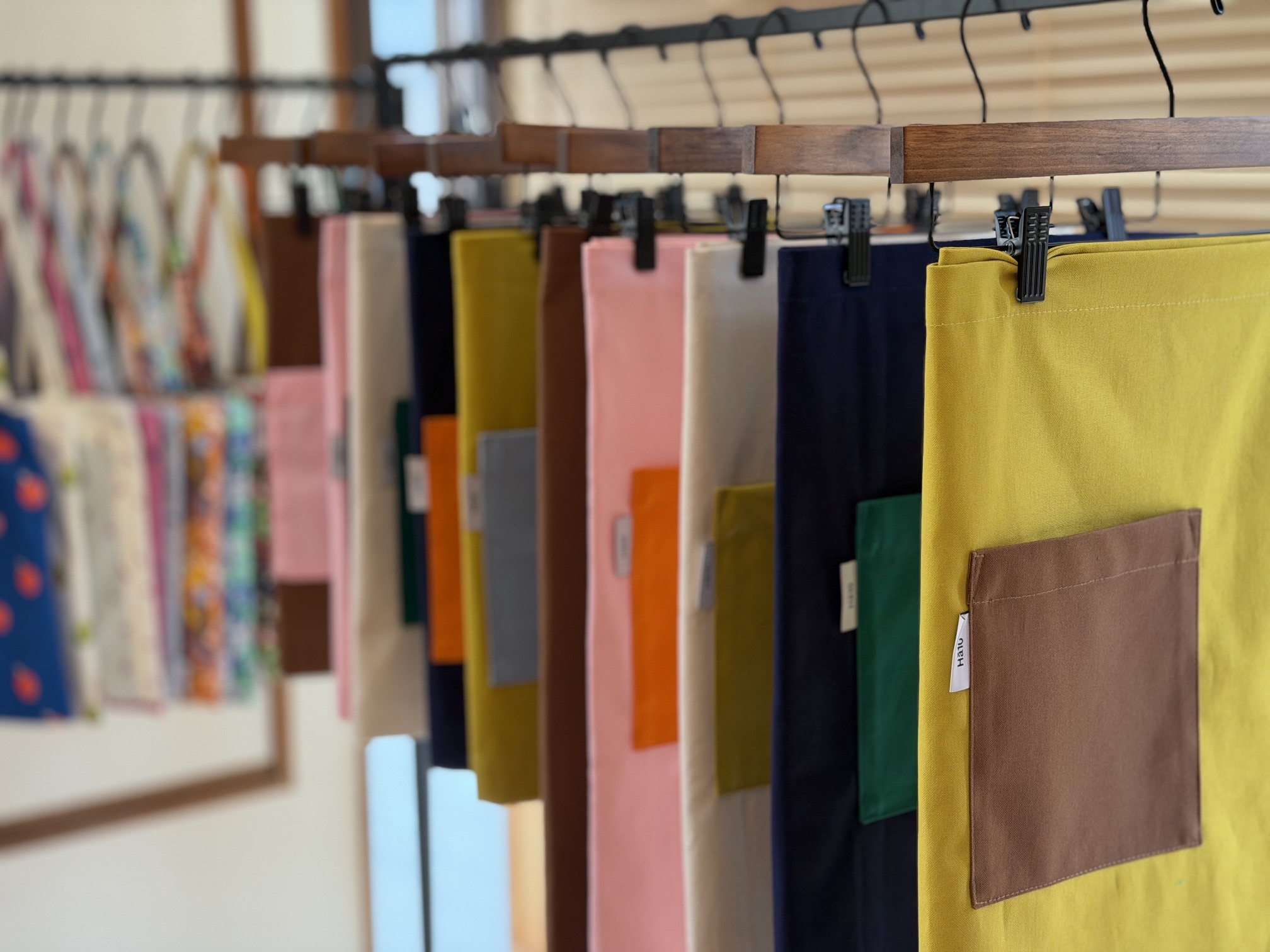 トートバックは手捺染で染めた生地を使い仕上げ、エプロンは帆布という分厚く丈夫な生地をHa10らしく色の組み合わせを楽しんでもらえるようにしている。