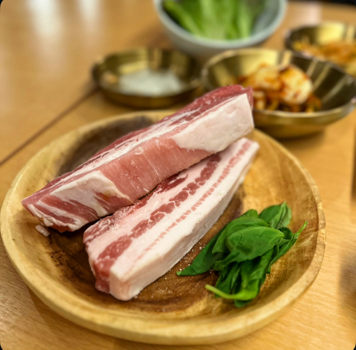 一定の温度を保った空間で10〜14日ほど寝かせた豚肉、熟成サムギョプサル。その時々でベストな状態の国産豚肉を見極めて仕入れています。