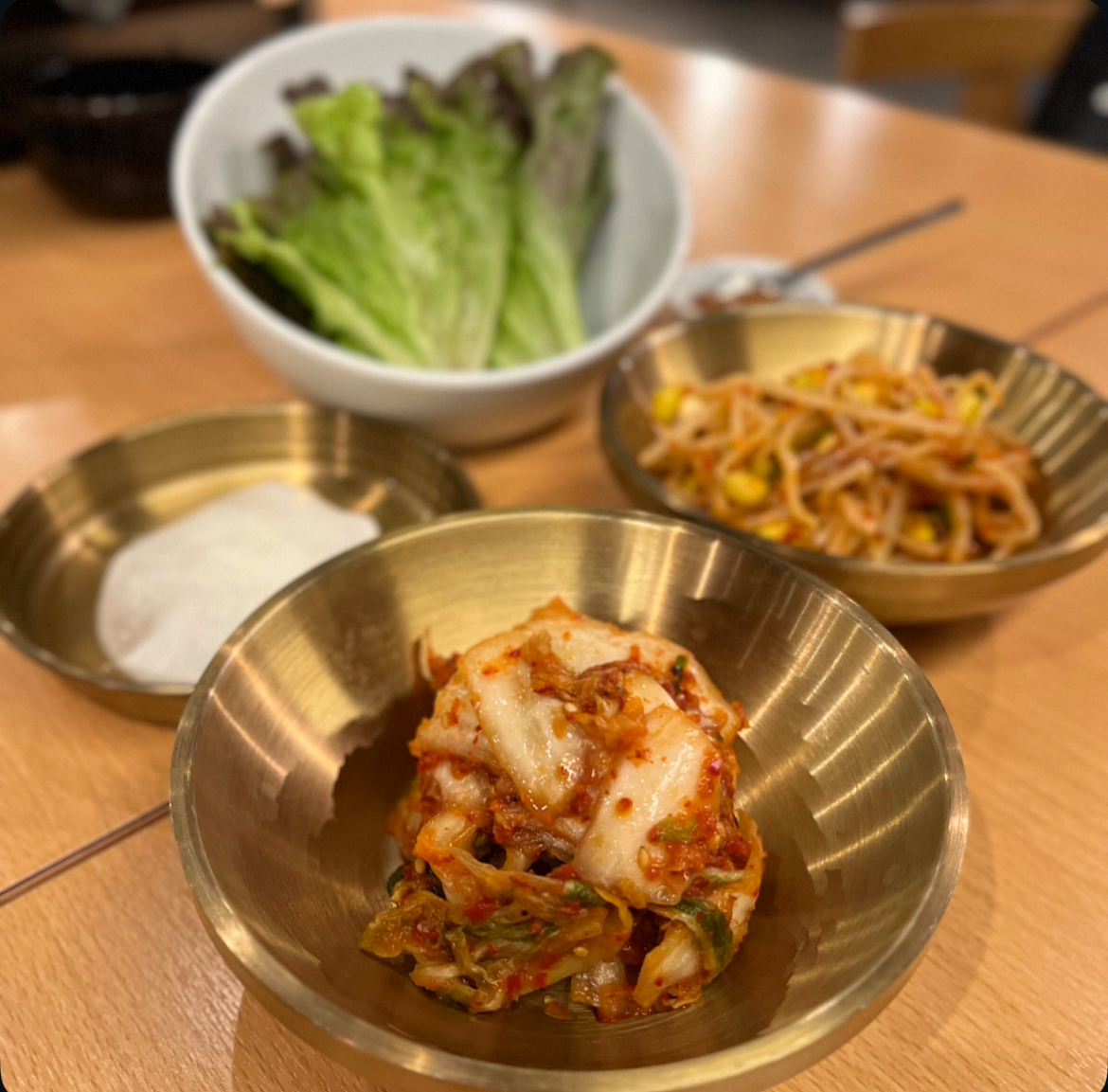 白菜キムチ、もやしナムルと一緒に包み野菜で頬張ります。