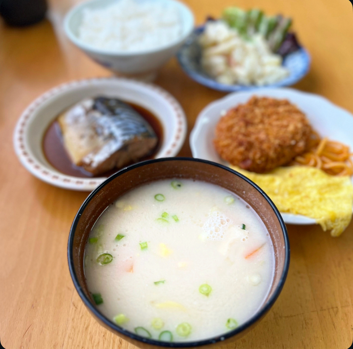 「豚汁定食」や「肉吸定食」などの汁物を決め、ショーケースから好きなおかずを取るスタイル。冬季は粕汁でほっこりと、また6時から営業しており朝食利用もおすすめ。