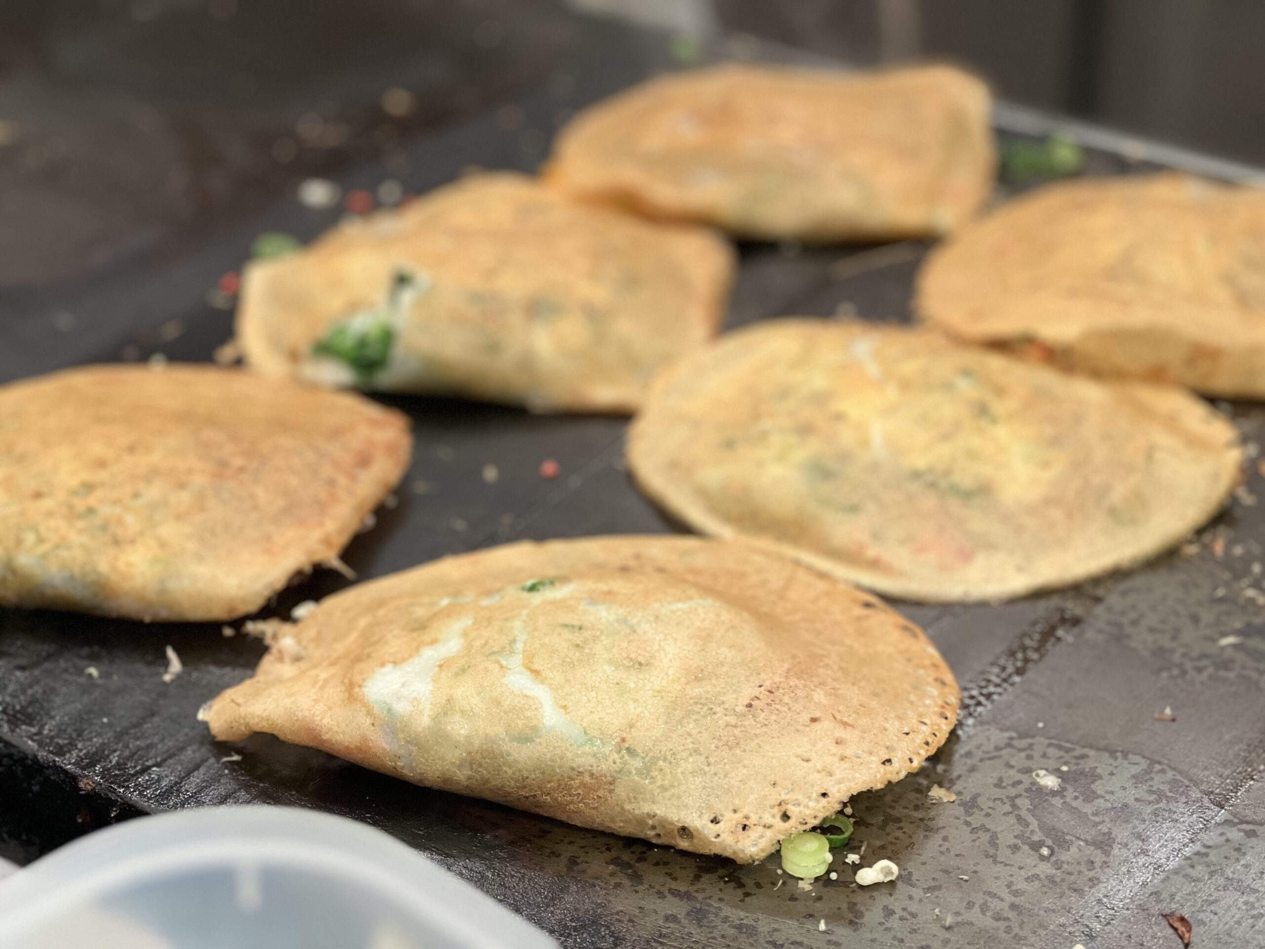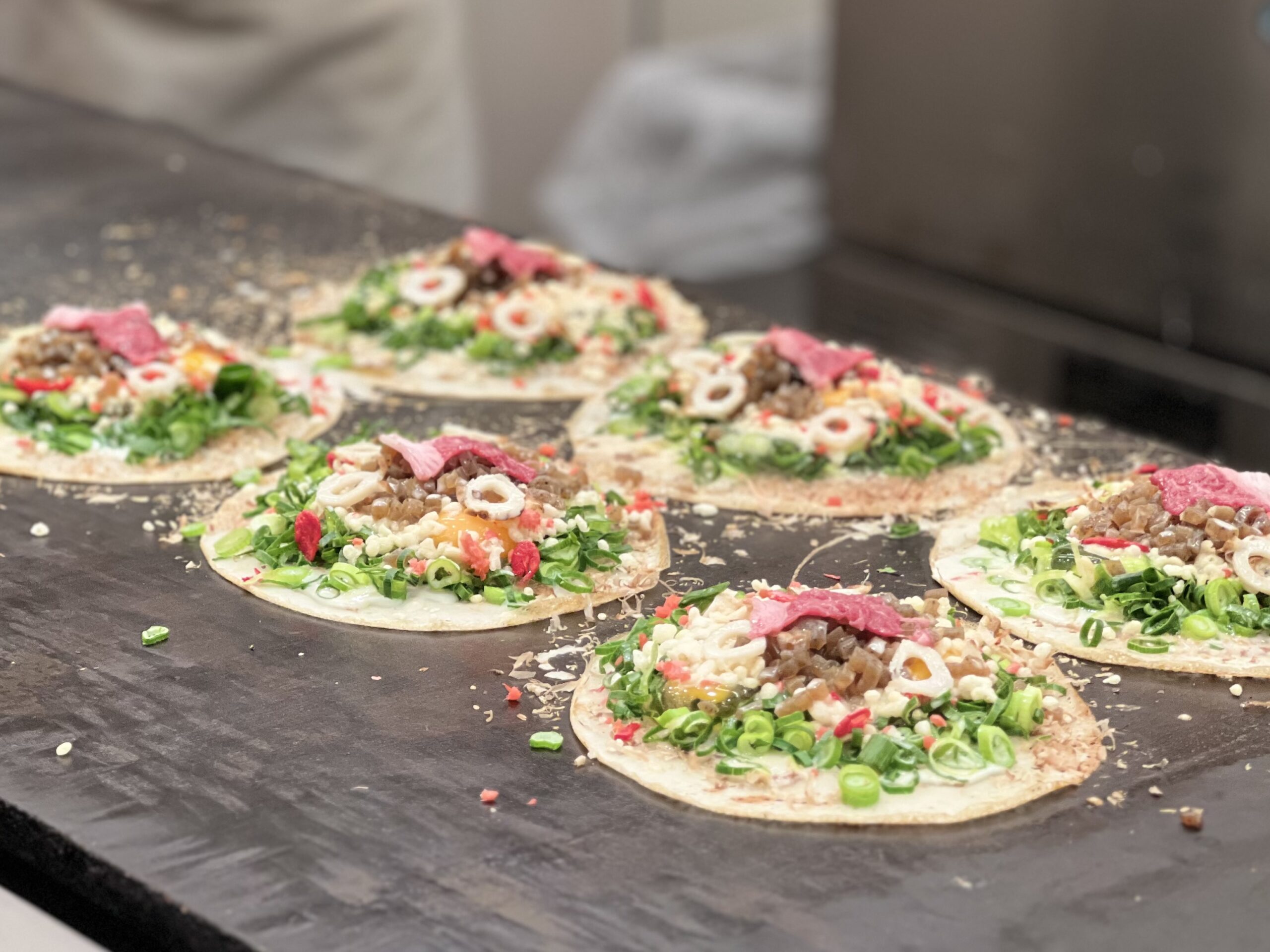 小さく切られたこんにゃくにちくわがまたいい食感を出してくれます。ネギ、天かす、桜エビ、生姜、牛すじ、タマゴが生地に包まれています。