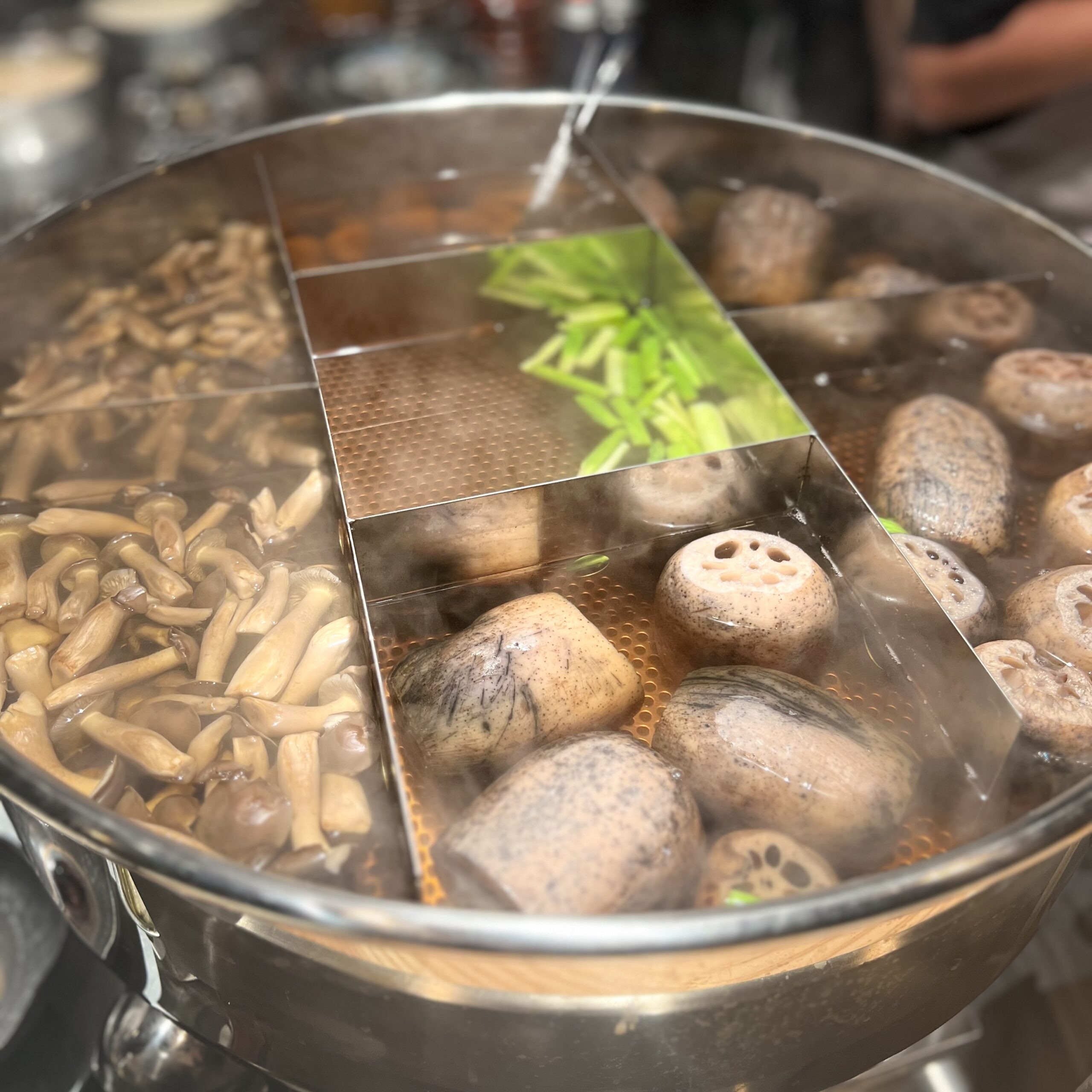まずはカウンター中央でぐつぐつ煮込まれる大鍋の煮野菜から。