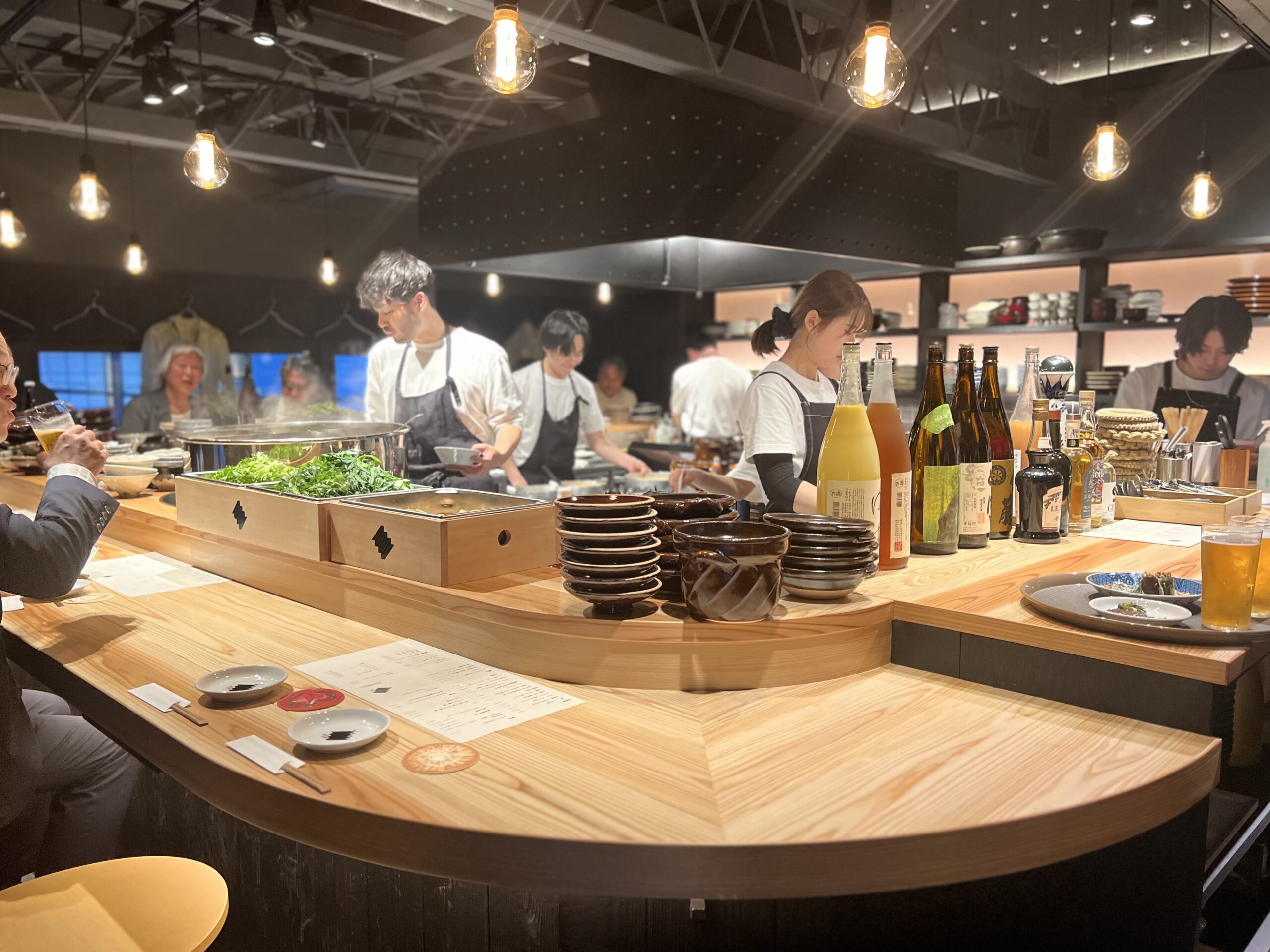 カウンターど真ん中に置かれた自慢の大鍋でその日届いた京野菜たちをコトコト煮たり、さっと炊いたり、湯がいたり…。
