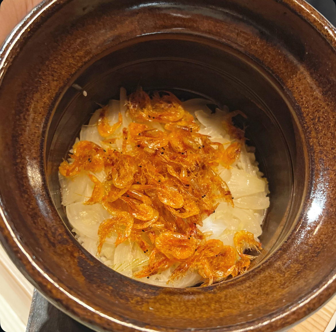 〆は新玉ねぎと桜エビの土鍋ご飯 1950円