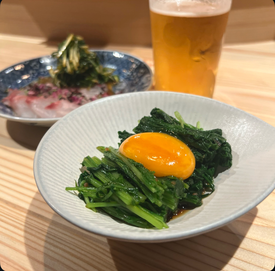 シャキシャキに茹でた自家農園のルッコラを卵黄ユッケダレで。