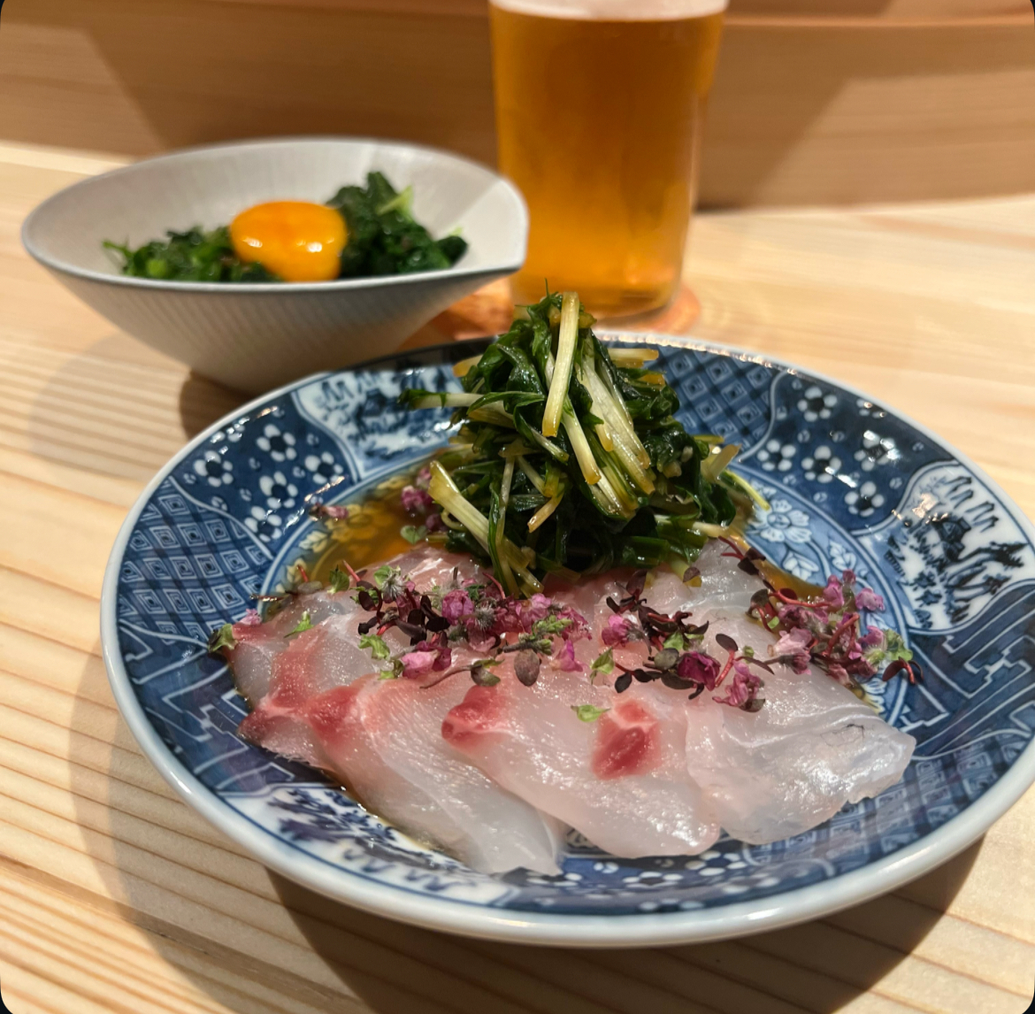 桜鯛の甘味にシャキシャキ水菜と醤油が効く。