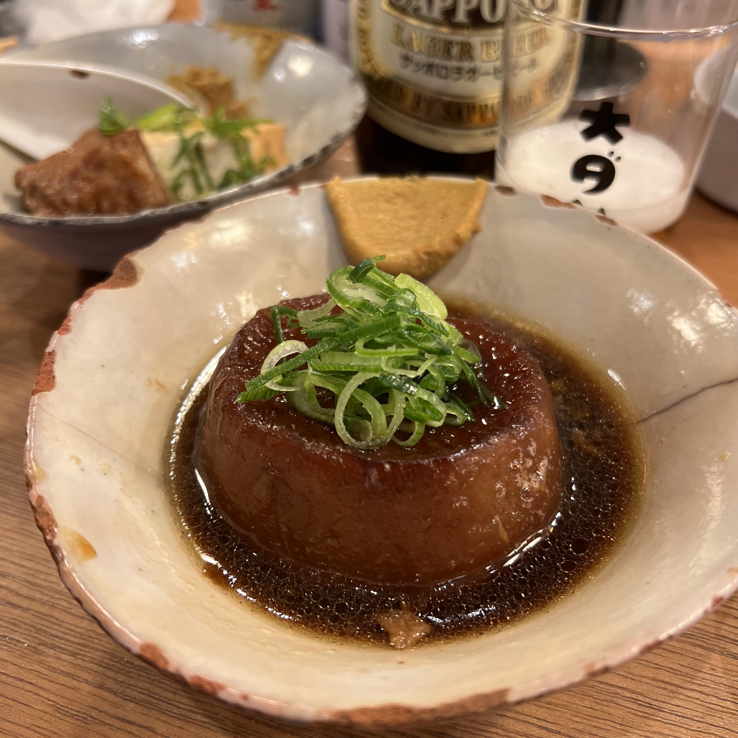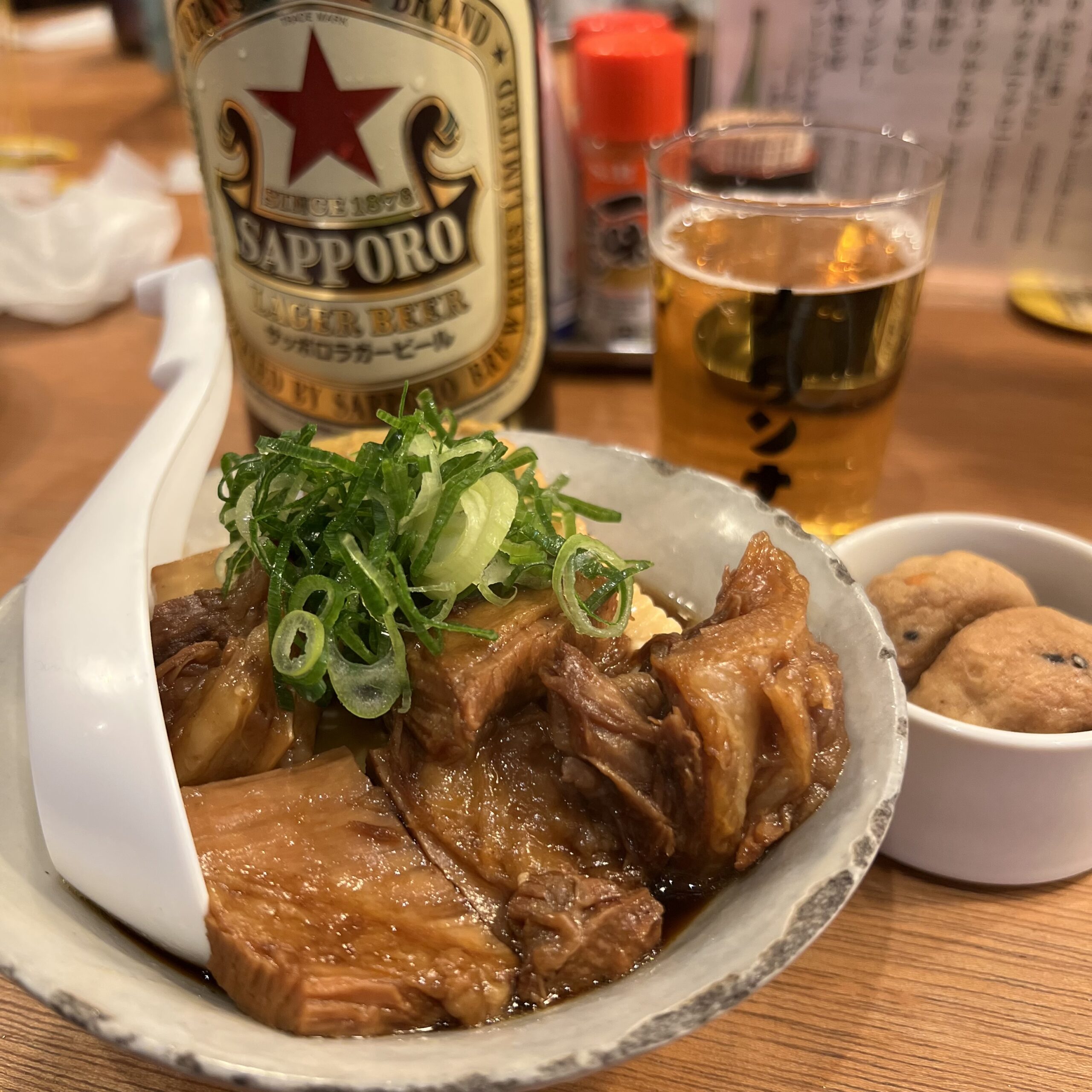 大鍋で13~14時間ほど煮込んでおり豆腐、肉、牛スジに味がしっかりと染み込ませ柔らかく仕上げています。注文必須の逸品。