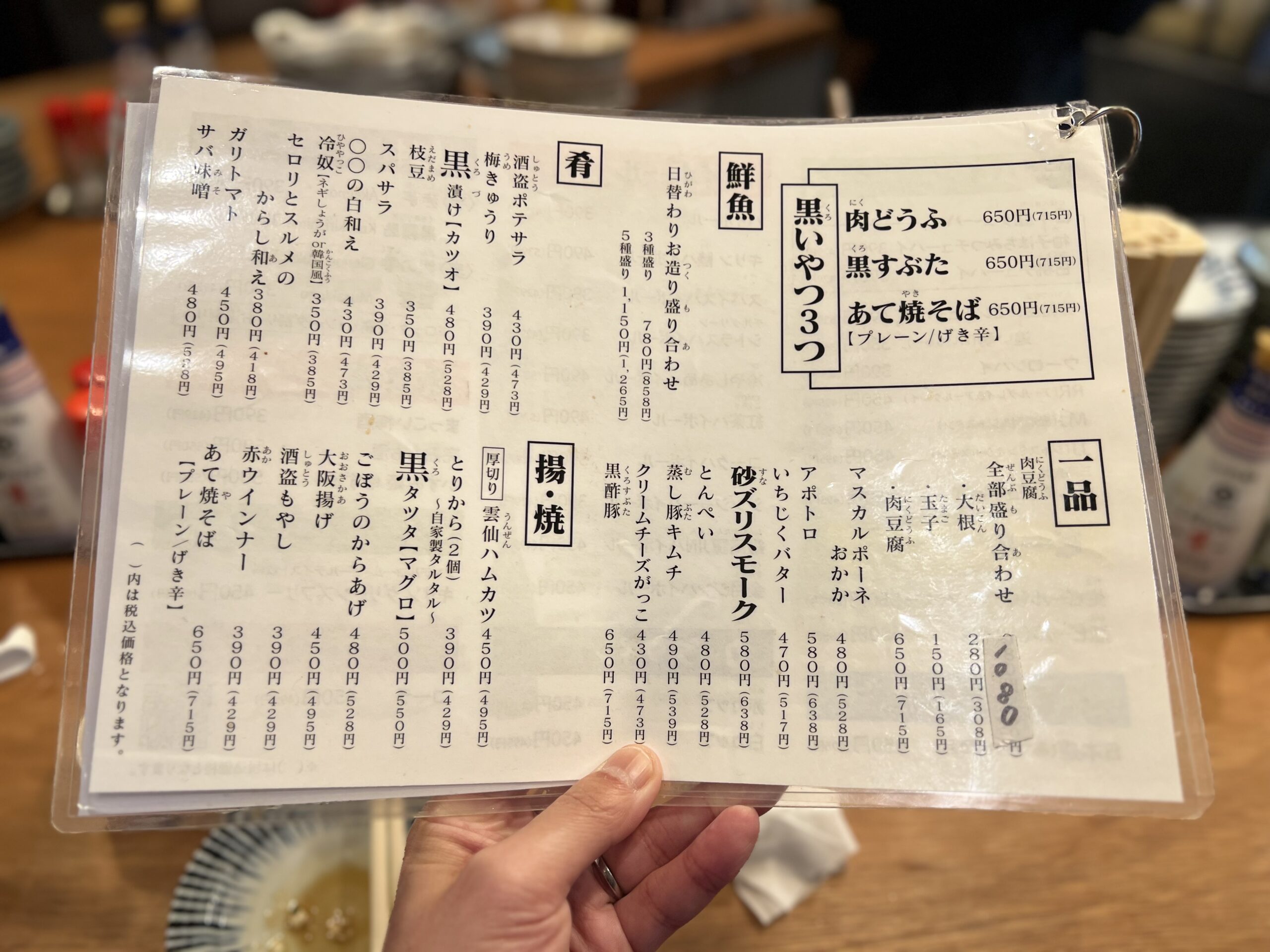 肉どうふ、黒すぶた、あて焼きそばなど黒いやつ3つを始め、鮮魚、アテ、一品など目白押し。