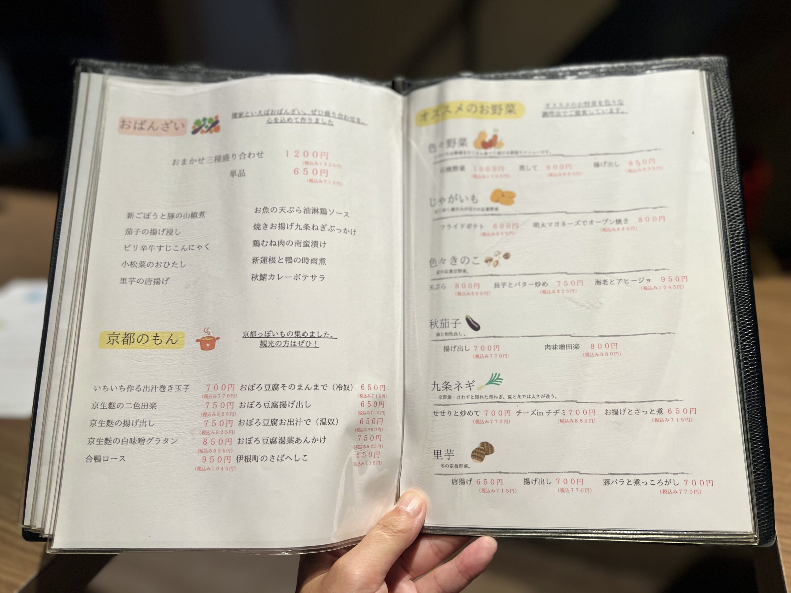 メニューは京野菜や鮮魚をふんだんに使用した逸品やアテがズラリ。