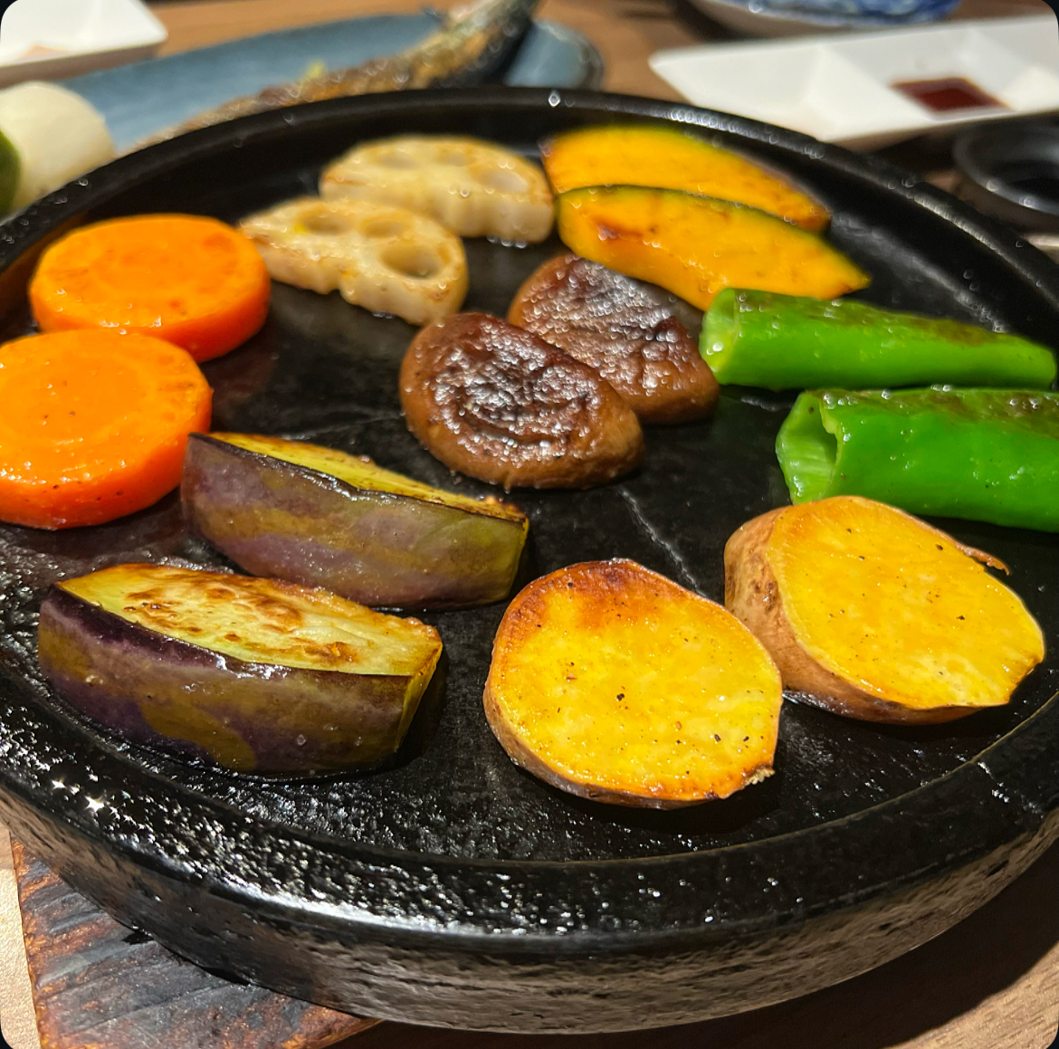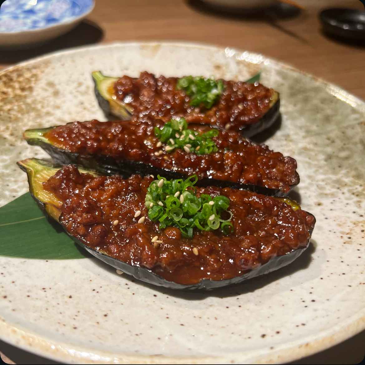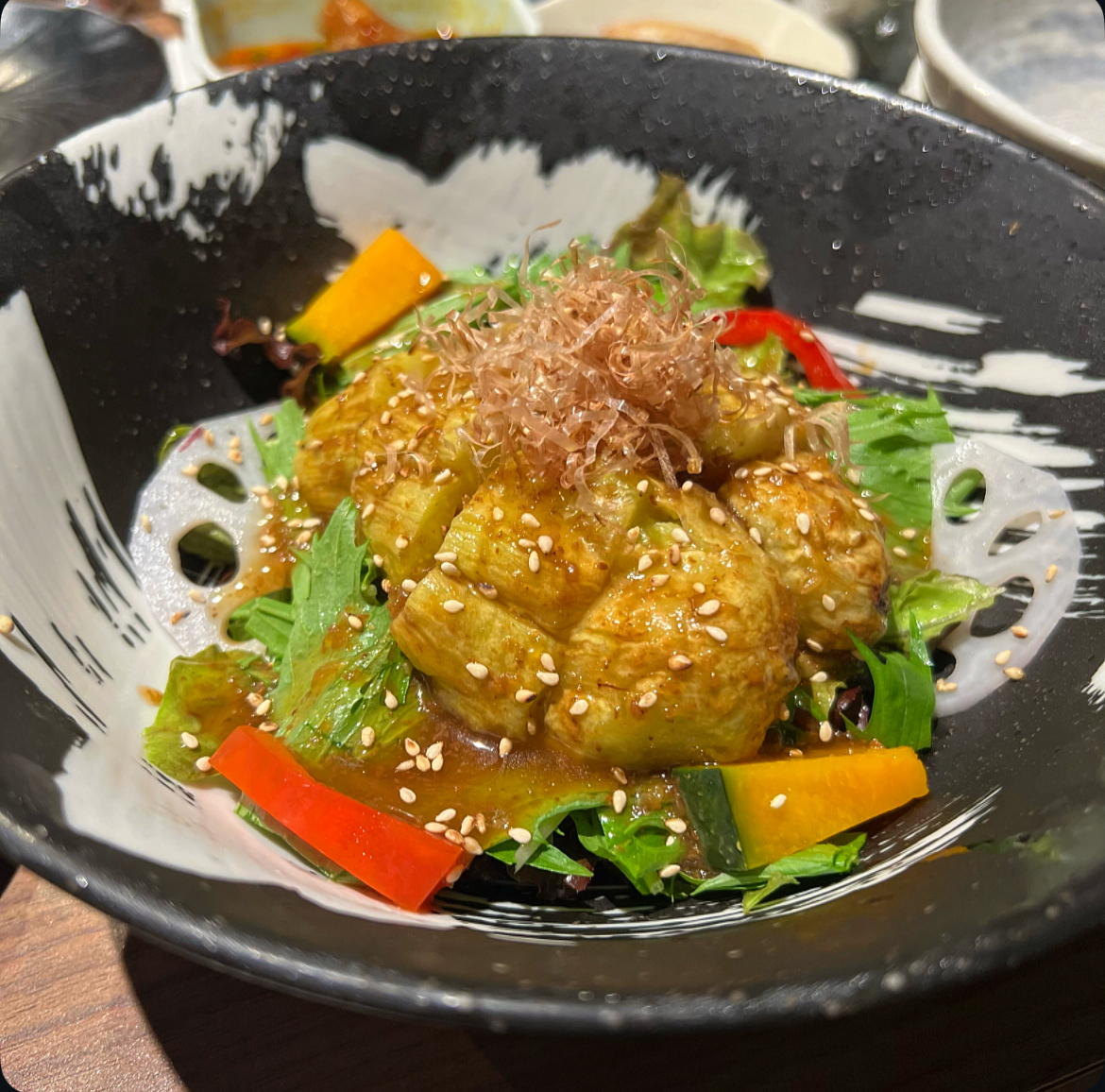 とろりとした焼き茄子とサラダが口の中をさっぱりしてくれます。