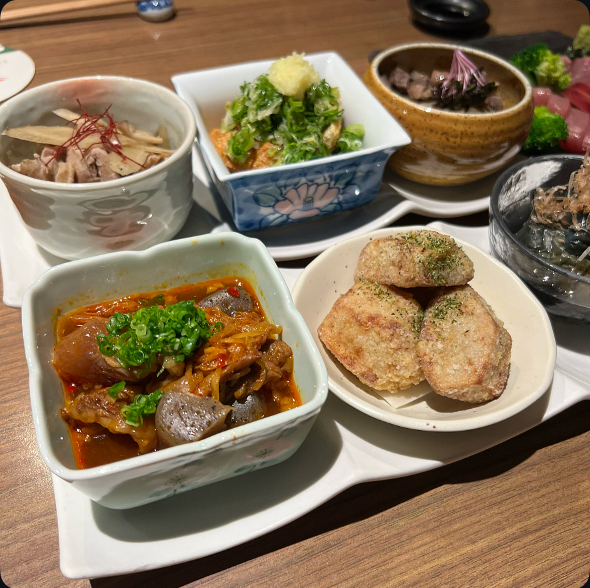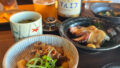 ・新ごぼうと豚の山椒煮・茄子の揚げ浸し・ピリ辛牛すじこんにゃく・里芋の唐揚げ・焼きお揚げ九条ねぎぶっかけ・新蓮根と鴨の時雨煮