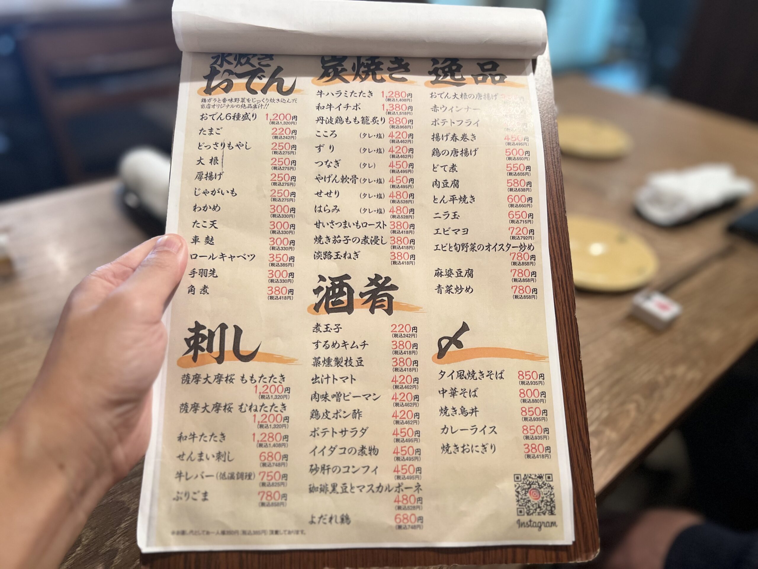 メニューは炭焼きをメインにおでんや煮込み、逸品など定番の居酒屋メニューが並びます。