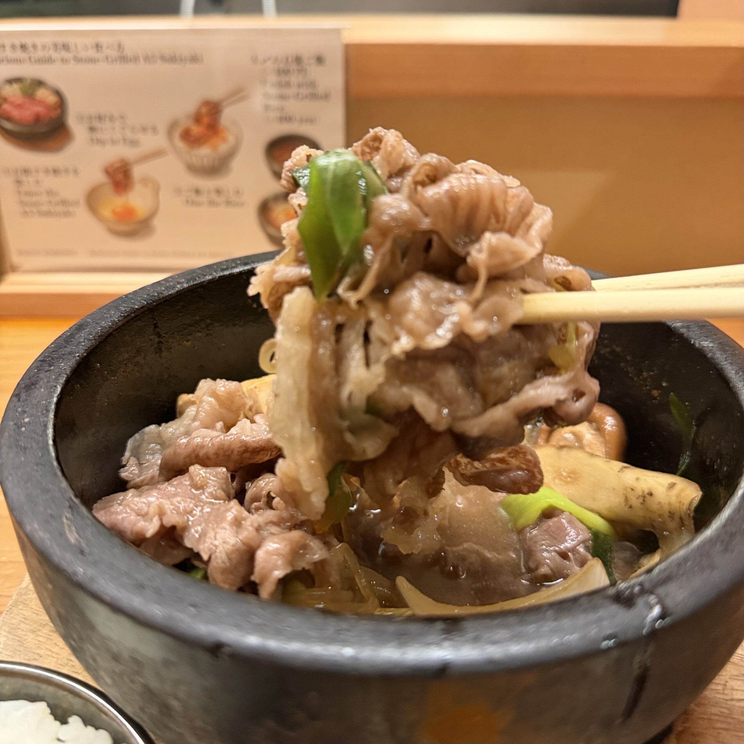 熱々の石焼ですき焼きを提供。