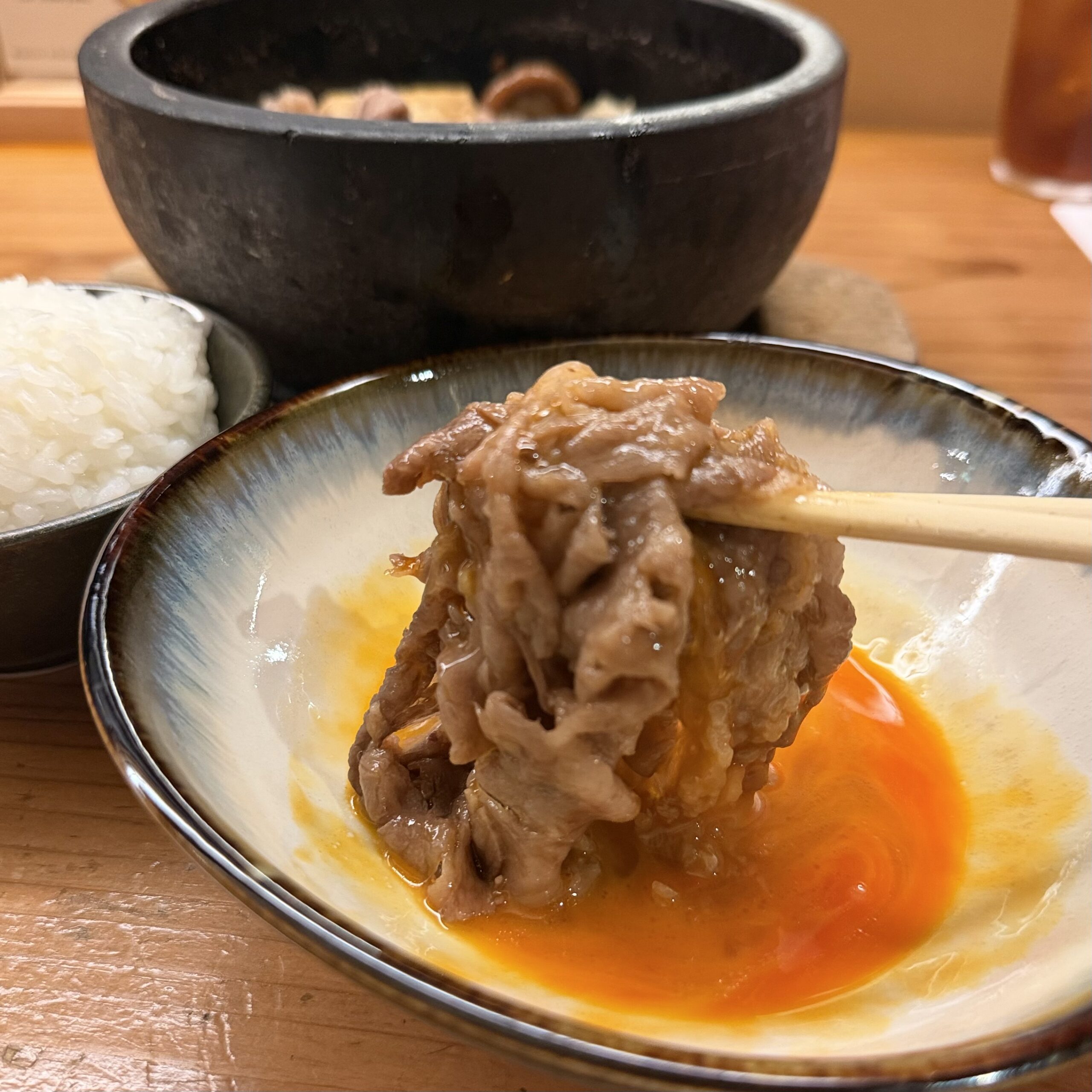 レア状で提供されるお肉を石焼で煮込んでいきます。