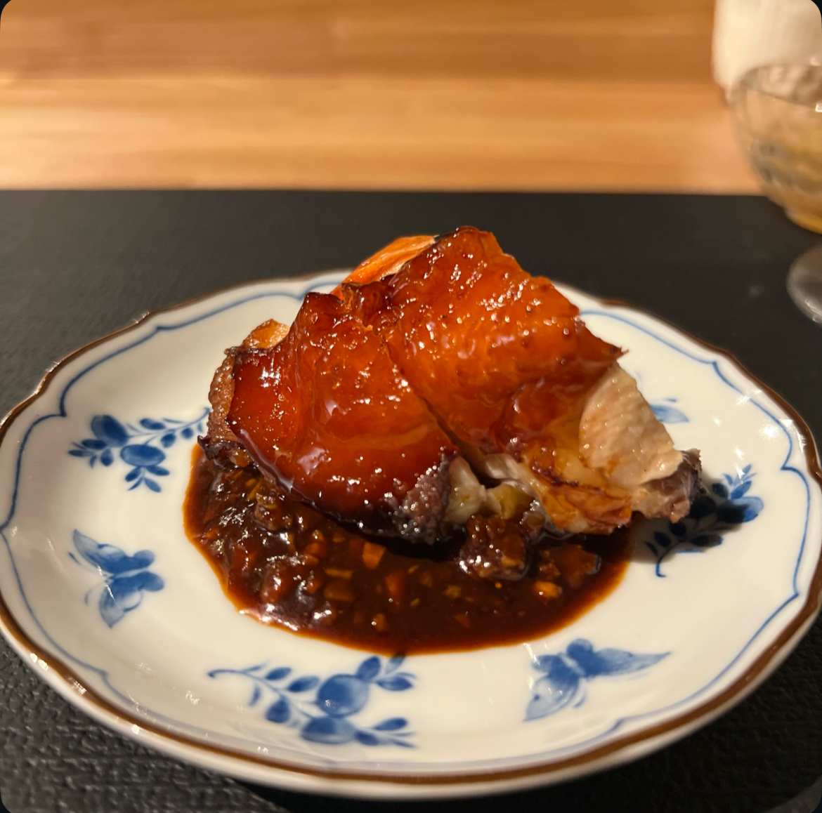 飴掛けで半日熟成、低温で素揚げしパリパリ食感を維持。