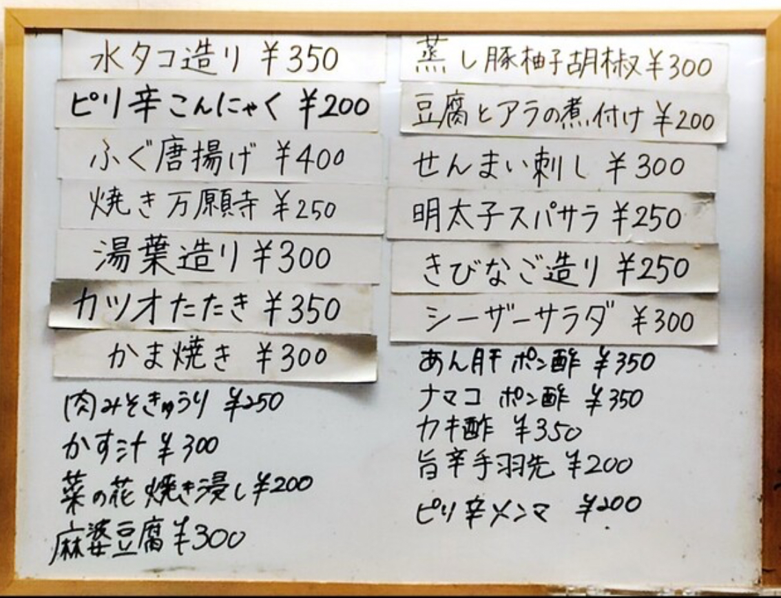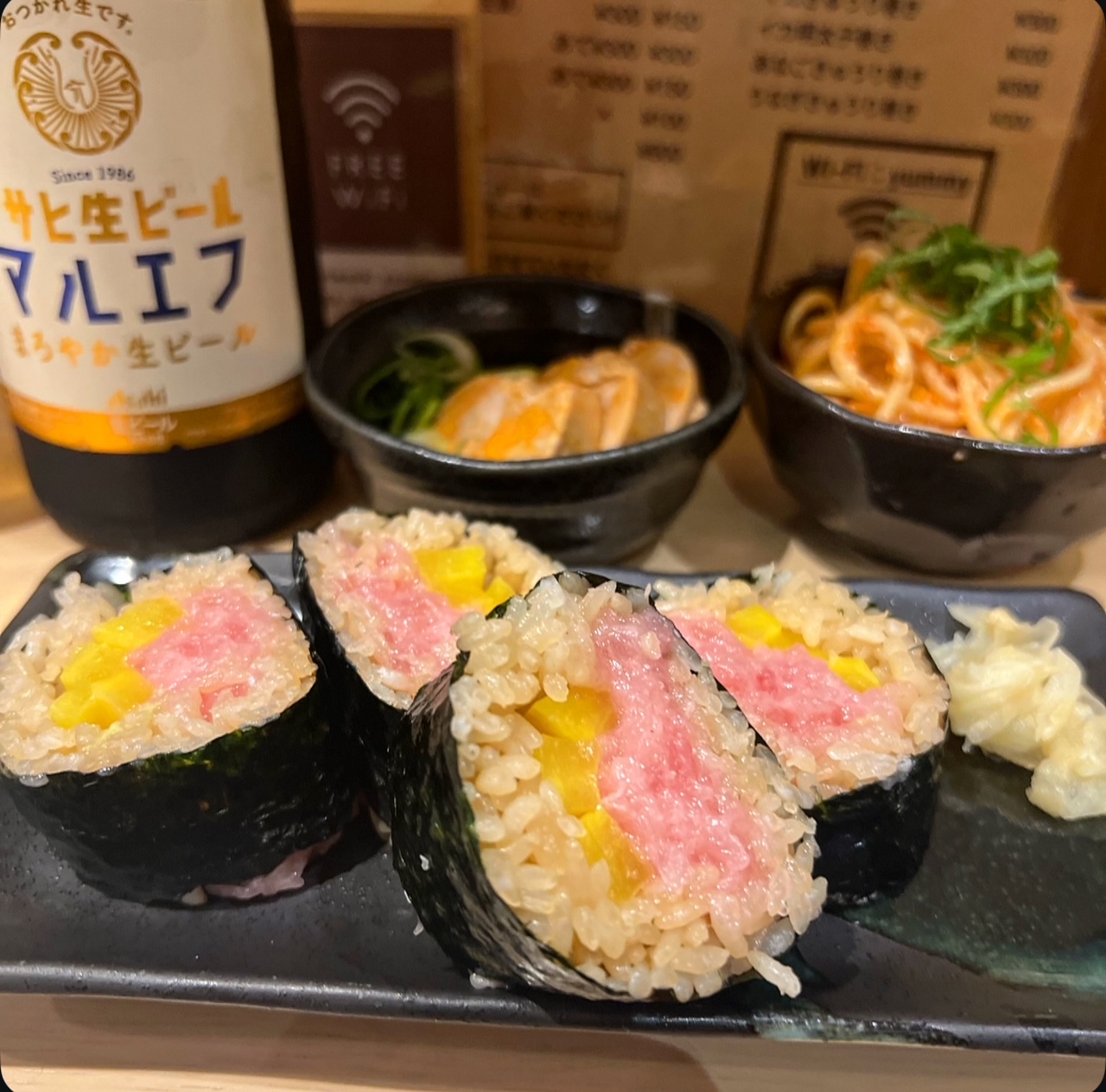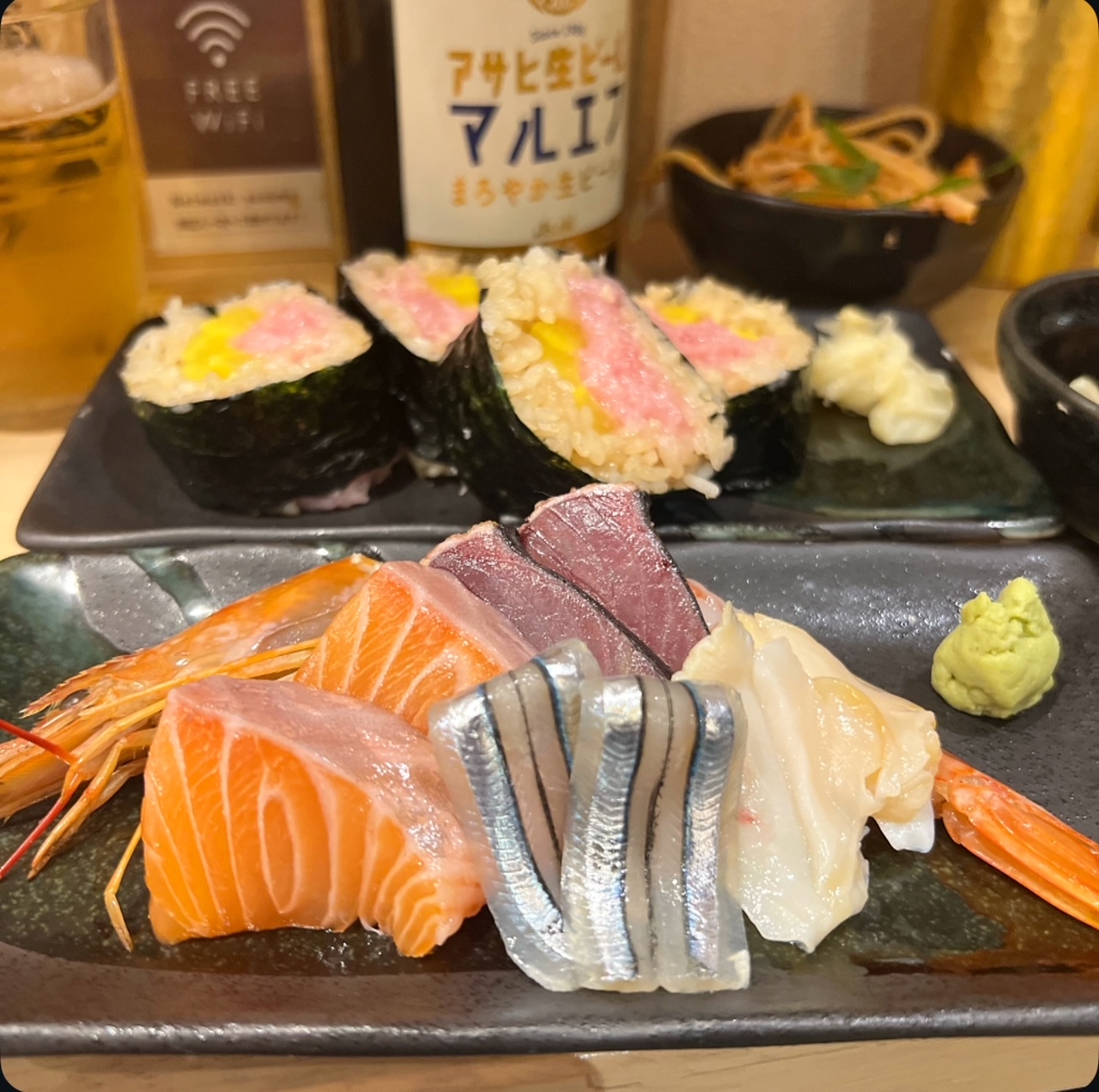 ビール350円、ハイボール250円をはじめ、寿司は1貫150円~、鮮魚やアテ、逸品も目白押し。食べて飲んでもお釣りがくる高コスパ立ち飲み店。