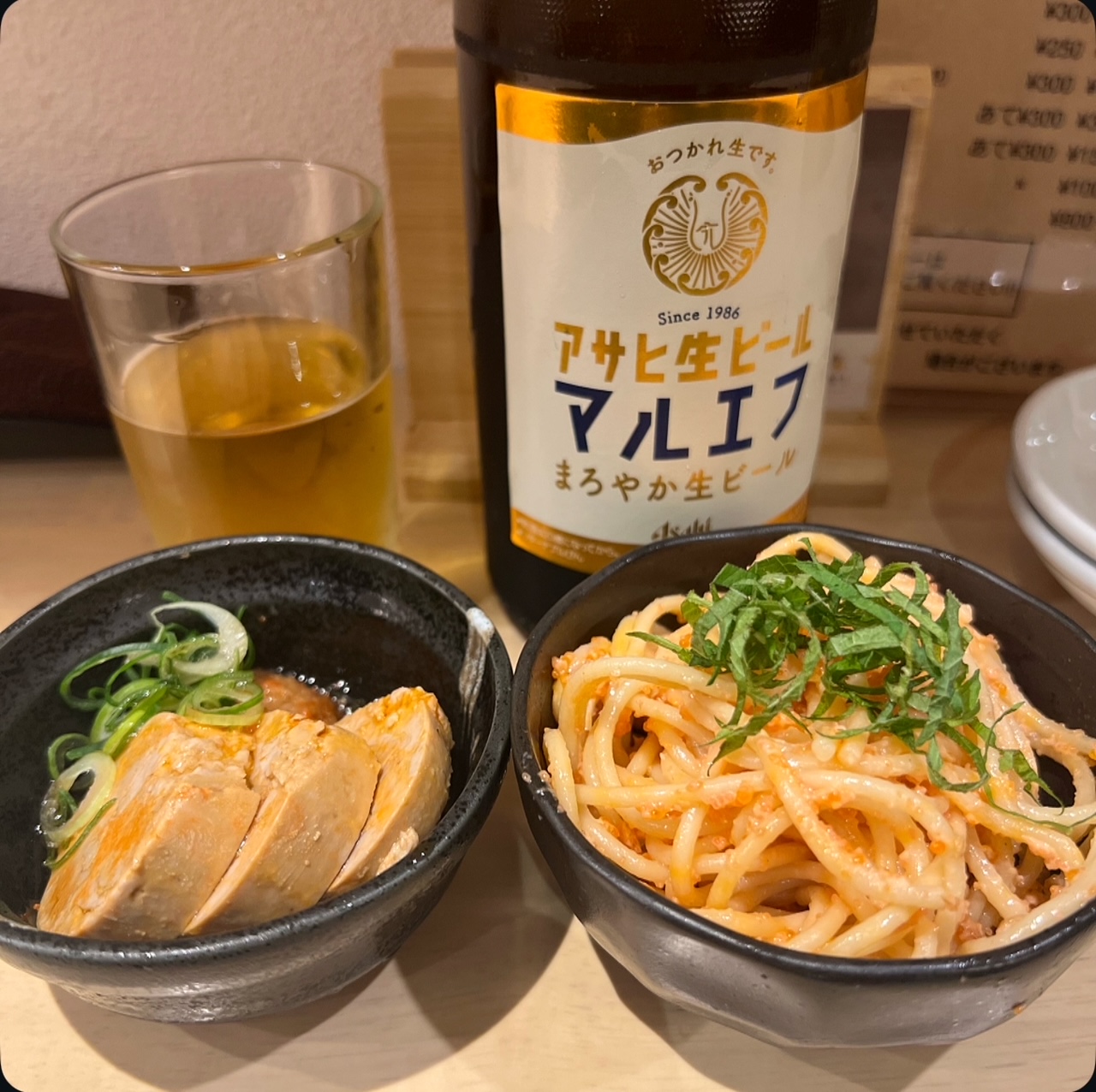 まずは明太子スパサラ 250円、あん肝ポン酢350円、マルエフ400円