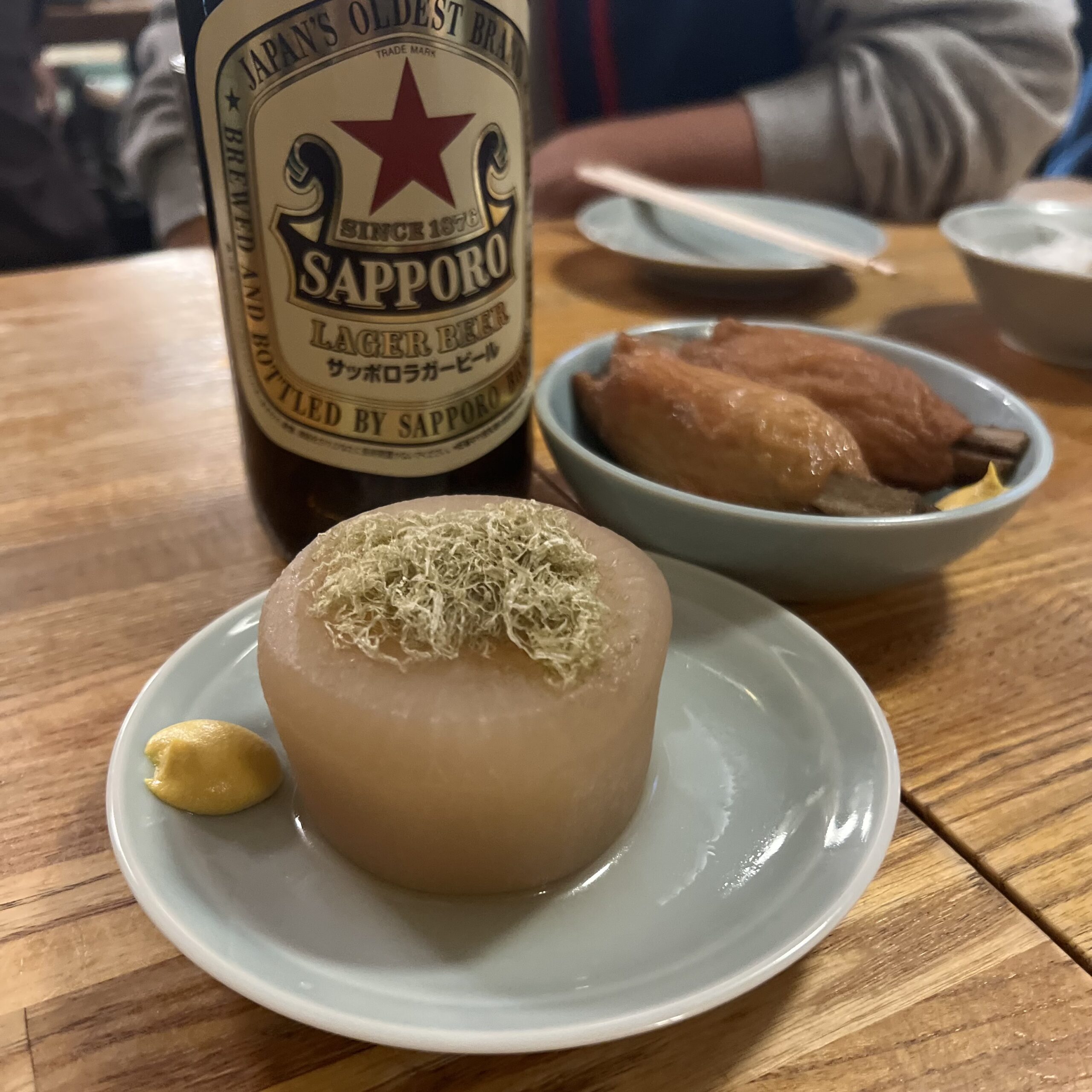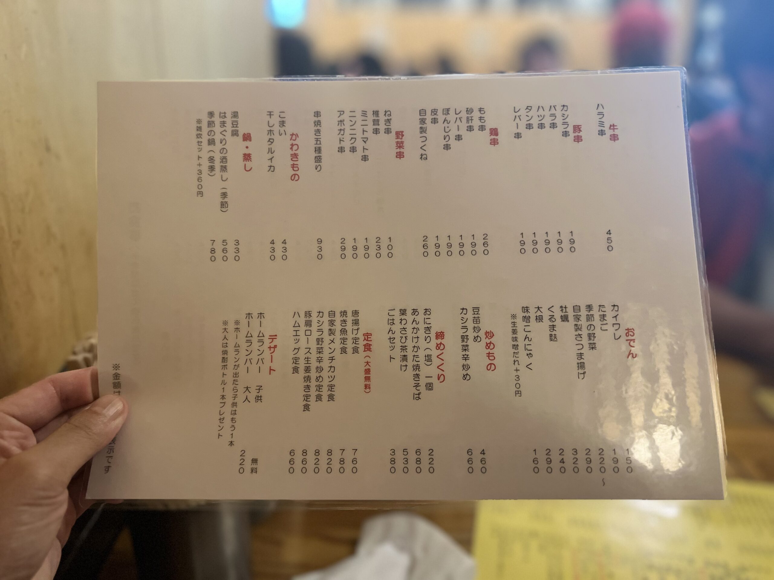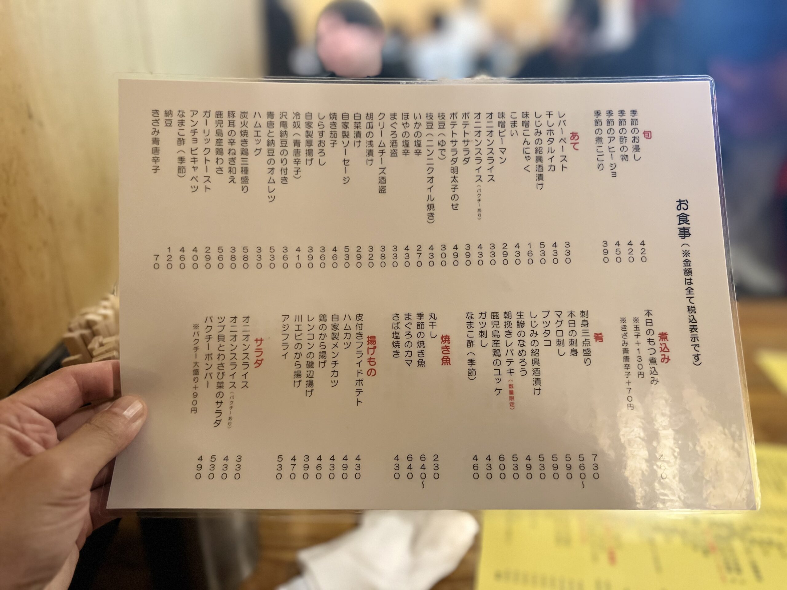 メニューは季節の逸品から豊富なアテ、煮込みにおでん、串焼きまで幅広い。