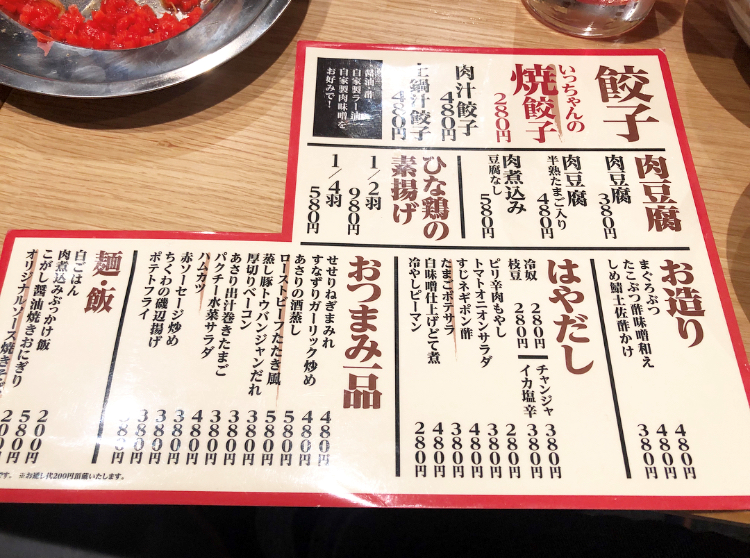 メニューは焼餃子280円、肉豆腐380円、ひな鶏の素揚げなど。その他酒場メニューが目白押し。