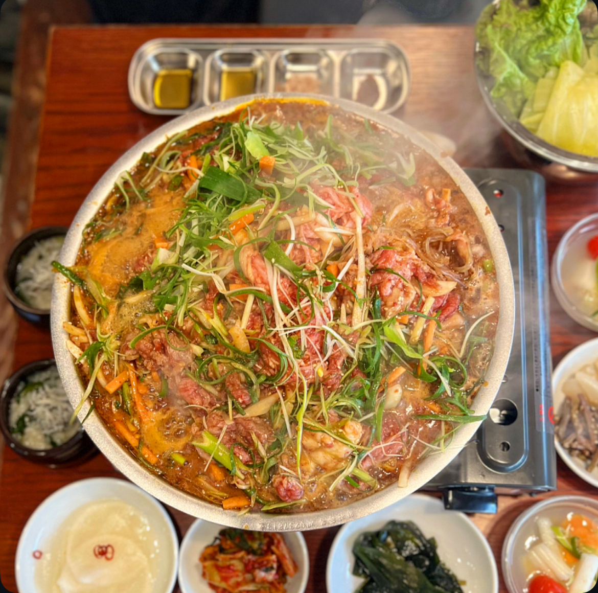 黒毛和牛を使った贅沢なプルコギに、季節のおかゆ、水キムチ、ナムル盛り合わせ、包み野菜、薬味、九条ねぎ、ごはん、スープ(チゲ)、デザートまでついたボリューム満点の内容。もちろんアラカルトや、単品の注文もできますよ。