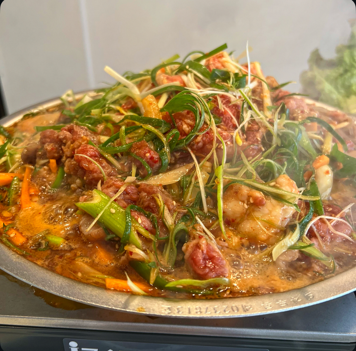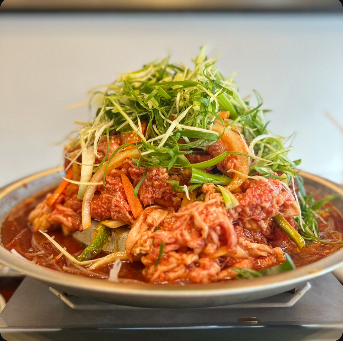 山型の韓国製プルコギ専用鉄板で、たっぷりの京都九条ネギと自家製の甘辛タレで食欲そそる!