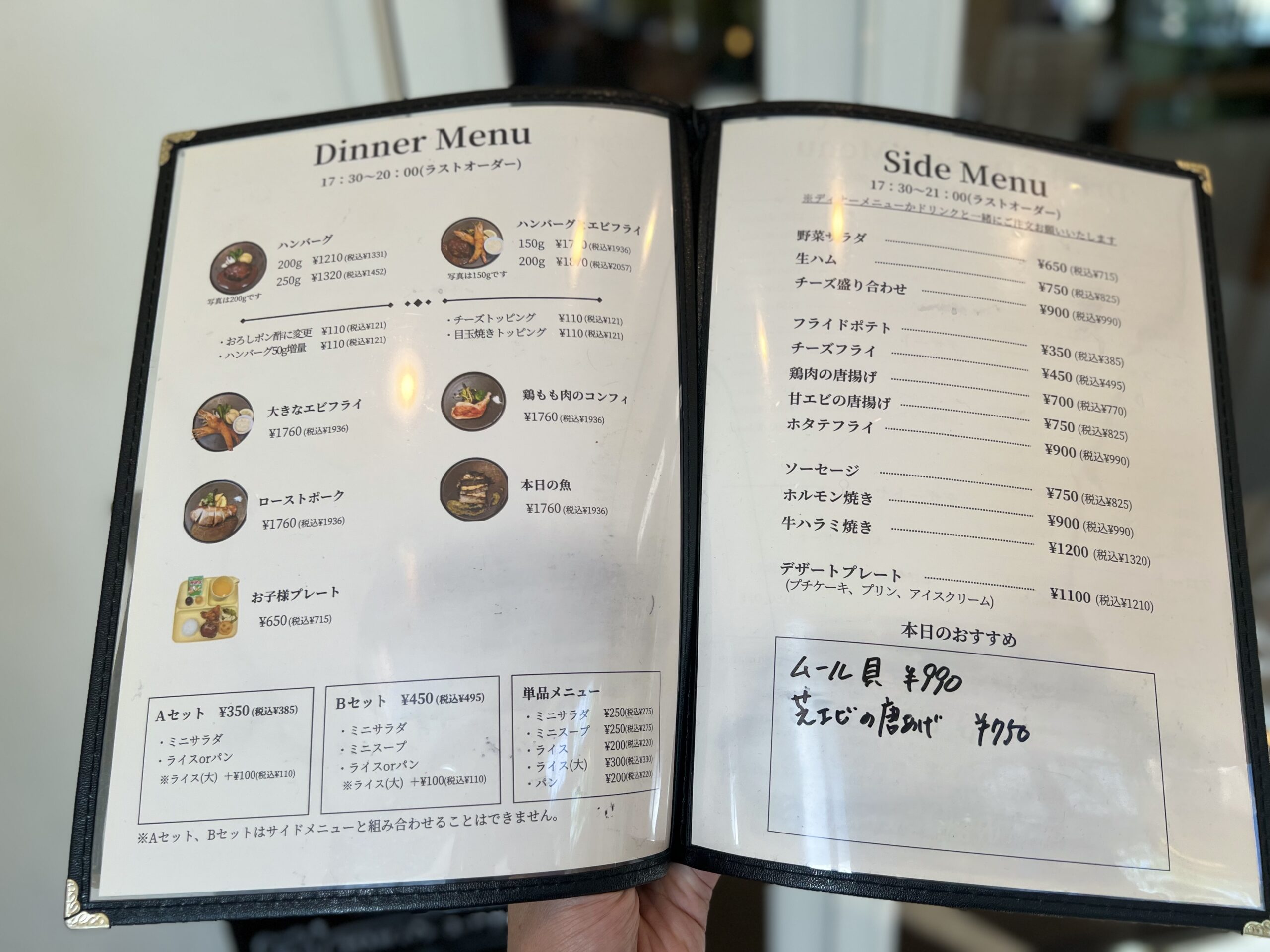 夜もランチ同様、ハンバーグや一品など洋食メニューがズラリ。