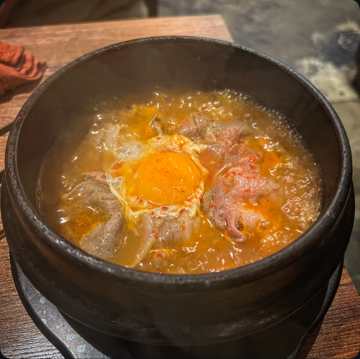 鉄板一面に焼き上げ、玉子を絡めいただきます。
