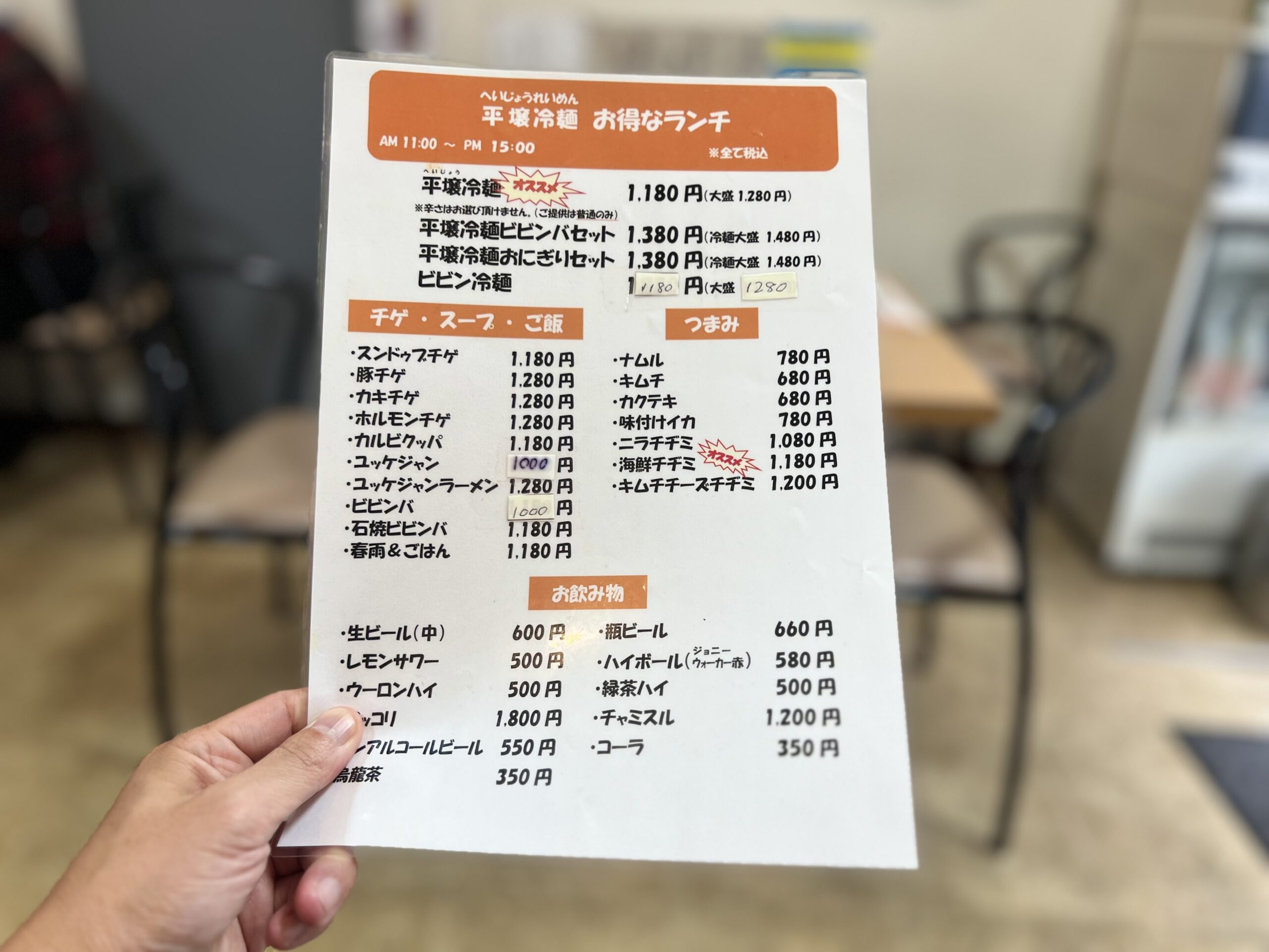 メニューは平壌冷麺をはじめ、ビビン麺や各種チゲなど。