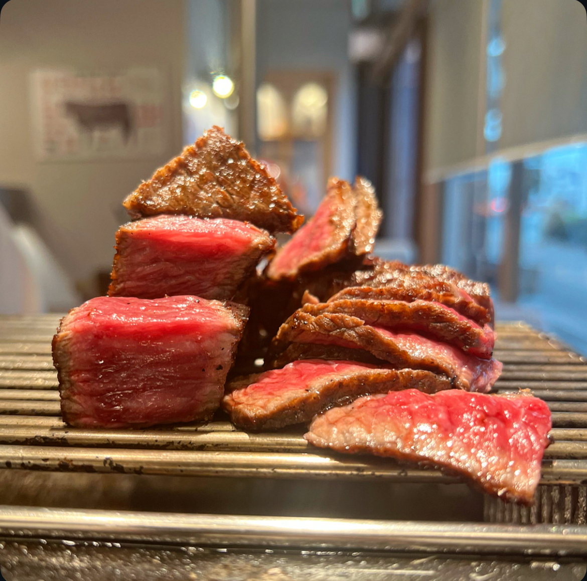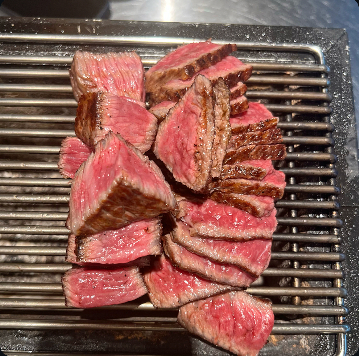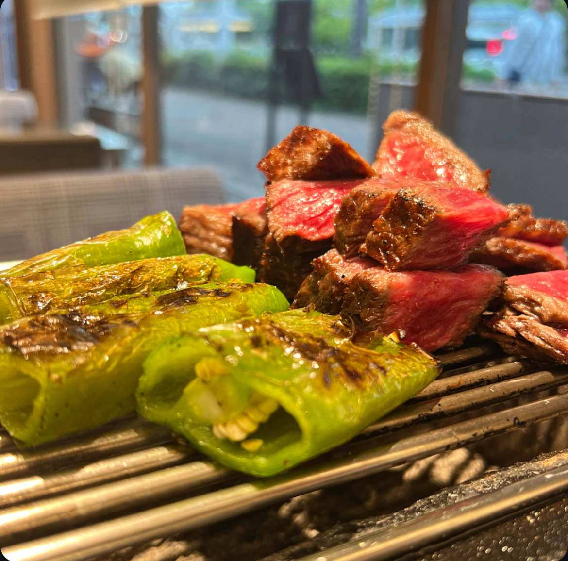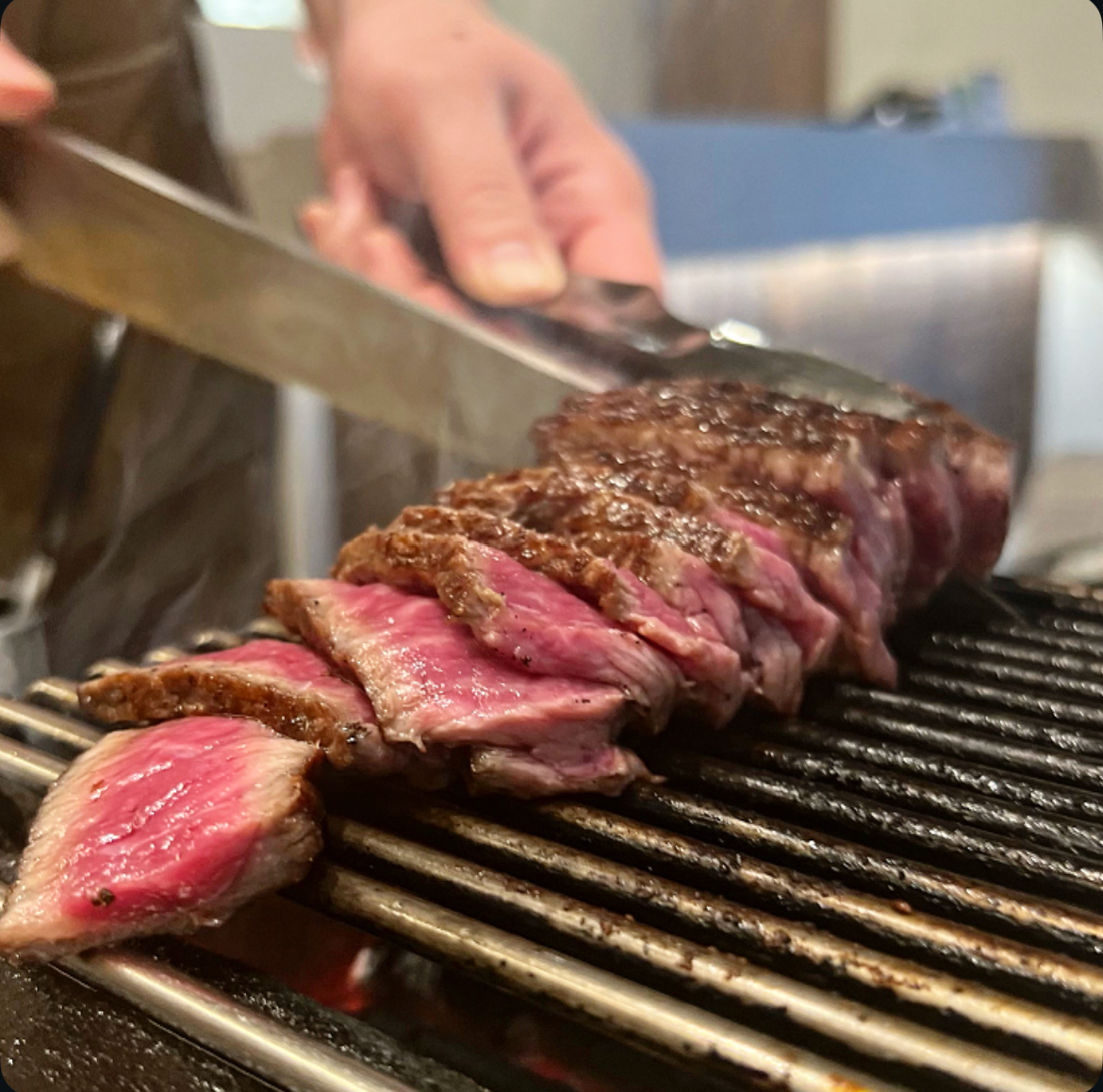 目の前で炭火で焼き上げた塊肉をカット違いでステーキと焼肉で味わえます。