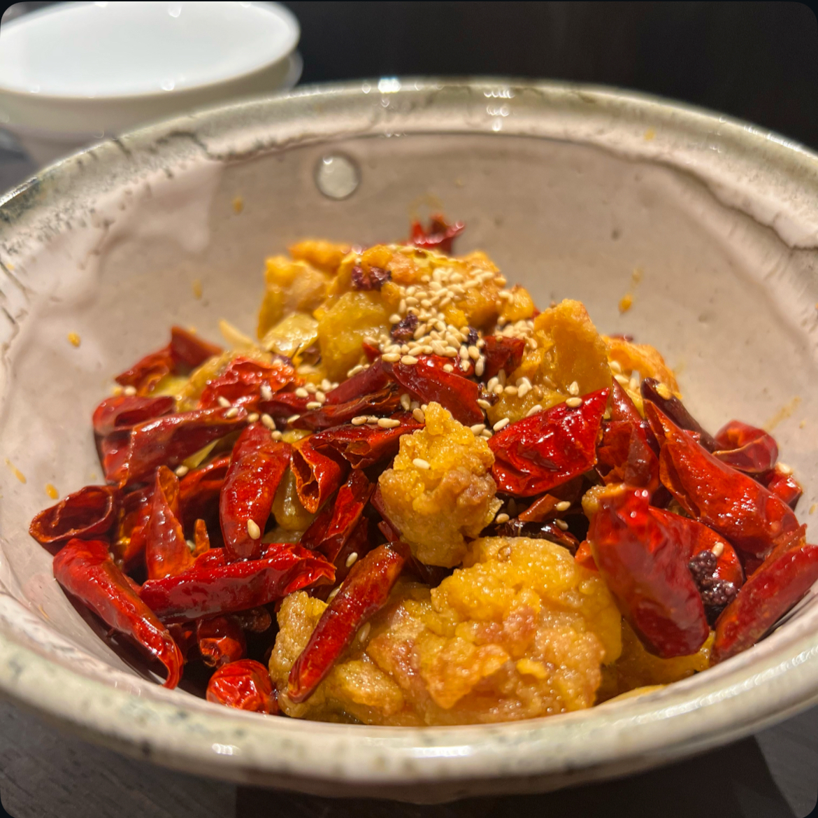 通常小ぶりな鶏で作り上げる辣子鶏を大ぶりな京赤地鶏で!